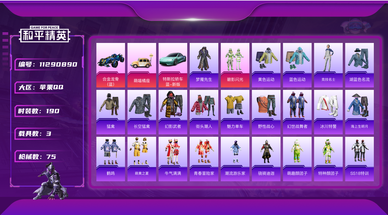 [11290890]1粉装 3载具 3印记 可二次 可修改实名 优质装备:合金龙骨(蓝),特斯拉Roadster(水滴蓝) 热门装扮:碧影闪光,梦魇先生 载具:萌喵橘座 紫色装扮:SS22特训,SS23特训,娇憨猪猪,萌趣咩咩,SS21特训,冰川特警,SS20特训,青春冒险家,潮流游乐家,SS15特训,暗夜傀儡,SS16特训,冰爽风暴,骁骑迪迦,治愈之星,科技之星,SS14特训,萌趣颜团子,特种颜团子,SS19特训,吉莉礼服,电音精灵,瑞龙福将,团圆交子,SS17特训,冰川谧蓝,SS18特训,野性战心,长空猛禽,荷畔雨呱,蓝色运动,虎虎生威吉莉,街头潮人,魅力单车,鹤鸣,黄色运动,龙的传人,龟仙人,柠萌假日,幻影武者,幻世战舞者,湖蓝色名流,福星高照,空投萌叽,牛气满满,猛禽,竞技名士,SS24特训(SS24特训套装),萌黄之夏,海上生明月 优质战备:炙焰牛王降落伞,第五大道降落伞,银刃赛罗降落伞,飞行器-王牌四分卫,烈焰拳霸降落伞,齐天大圣降落伞,海渊国主降落伞