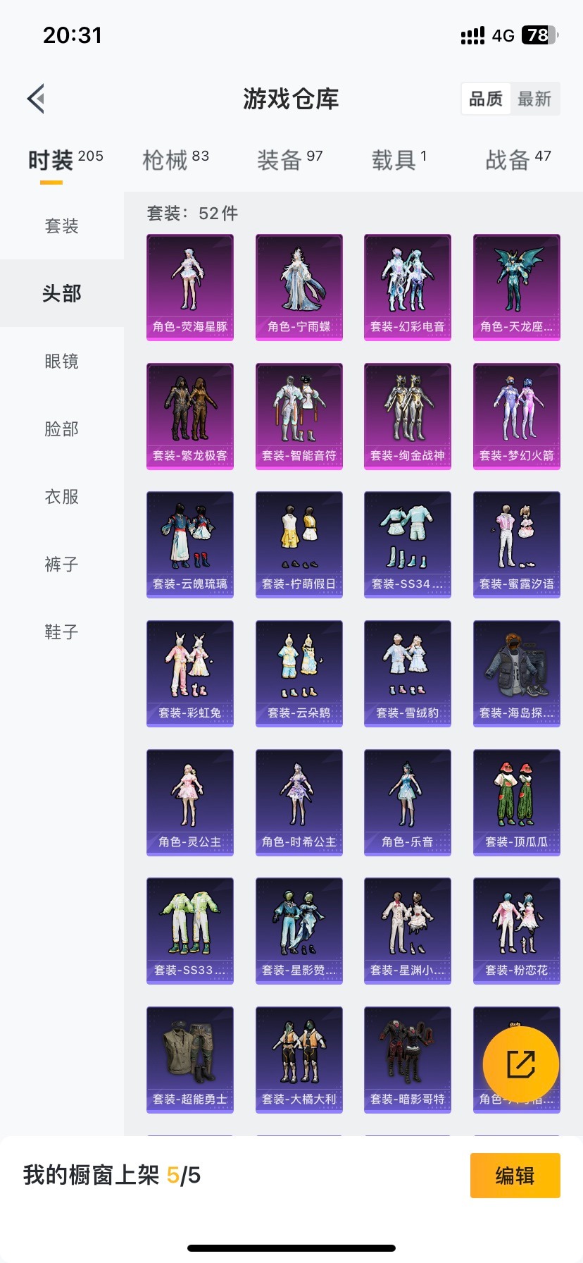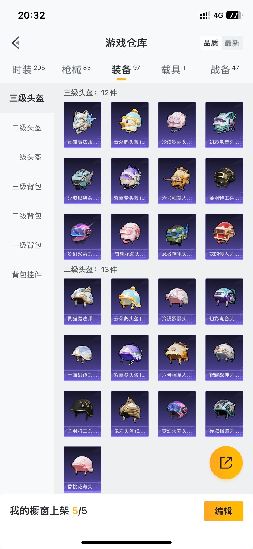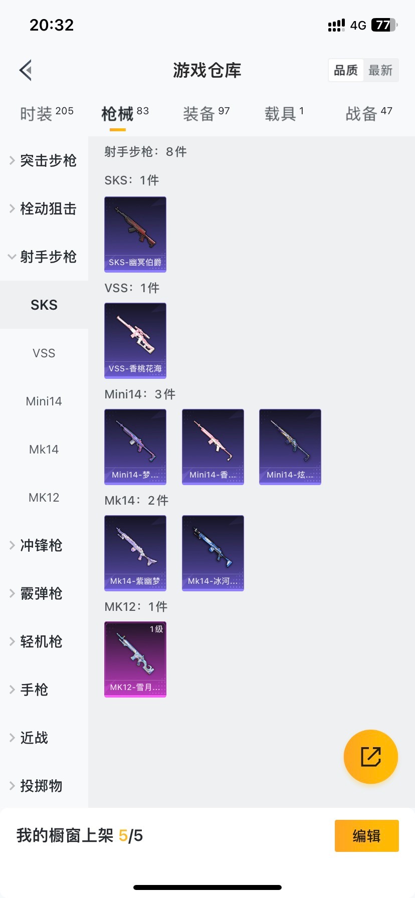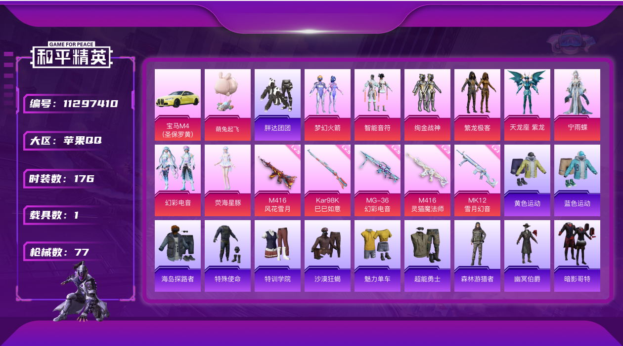 - [11884156]4粉装 7特效枪 1载具 7印记 可二次 可修改实名 优质装备:宾利欧陆GT敞篷(火焰橘),天禅智恒,Vector环太平洋,AKM绿萝繁花,SCAR-L-锦绣绵绵,M416电玩时刻,UMP45量子极限,千金淑猫,GROZA-镜光银凌,Kar98K-巳巳如意 热门装扮:青空秋雨,圣堂之誓,梦魇先生 五级特效枪:五级UMP45-量子极限,五级GROZA-镜光银凌,五级M416-电玩时刻,五级SCAR-L-锦绣绵绵,五级AKM-绿萝繁花,五级Vector-环太平洋 四级特效枪:四级Kar98K-巳巳如意 紫色装扮:SS22特训,SS23特训,幻彩翩翩,妙红点点,龙舌兰冰茶,娇憨猪猪,萌趣咩咩,SS21特训,SS31特训套装,冰川特警,冷焰舞者,SS30特训套装,SS33特训套装,长空猛禽,霓虹街区,风暴特警,荷畔雨呱,缤纷果语,耀眼新星,荣耀,魅力单车,黄色运动,黑色伏地魔,龙的传人,龟仙人,冰河战士,龙魂突击队,蝶变,柠萌假日,海岛探路者,幻影武者,空岛之星,王牌教练,牛气满满,特殊使命,特训学院,小熊娃娃,雏菊兔兔,萝兰蝴蝶,SS29特训,拉斐尔,鹿角斗士,星途旅人,创世·幻影,纯真浪花,热情海星,曼妙人鱼,SS28特训,卖崽青蛙,玉兔迎春,巳巳如意,青团波波,糖糖葫芦,竞技名士,街头风暴,深海梦境,惊鸿侠骨,神气柴柴,懵萌河马,SS24特训(SS24特训套装),SS25特训,锦衣飞扬,湖雨初晴,焰鹰斗篷,幻羽潜行,幽夜迷踪,SS27特训,蝶吟花词,云霞荷露,SS26特训,春光漫游,快闪甜心,智谋强哥,萌黄之夏,光之冒险 优质战备:创世·救赎降落伞,拳皇·狂花道降落伞,星途旅人降落伞,公主华盖飞行器,忍者神龟降落伞,江南烟雨降落伞,千金淑猫降落伞,垂柳戏鸭降落伞,南国舞曲降落伞,拂晓神骑飞行器,炫光之旅降落伞,飒粉甜心降落伞,梦幻火箭降落伞,伏魔团降落伞