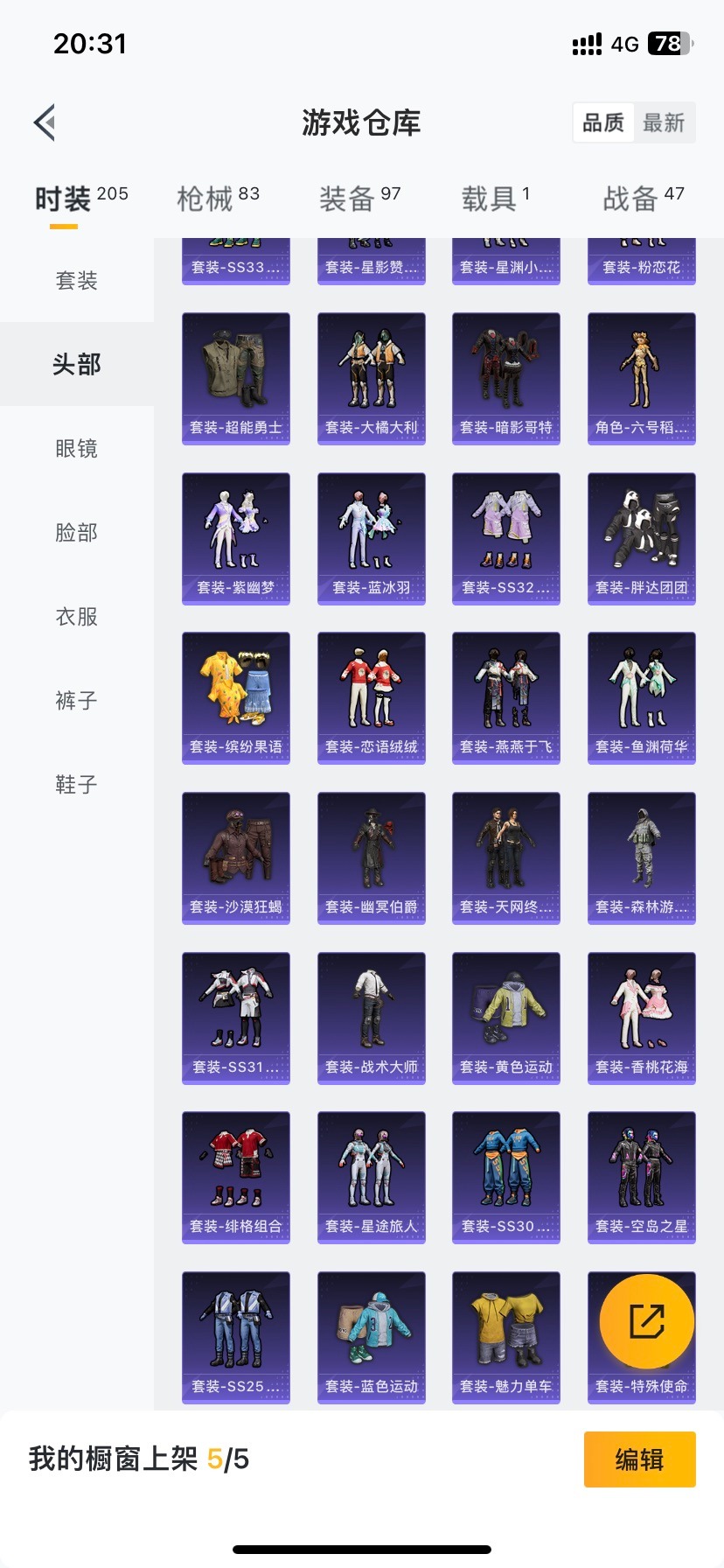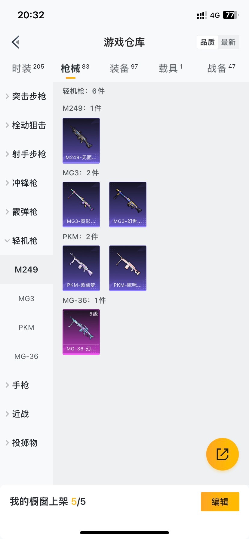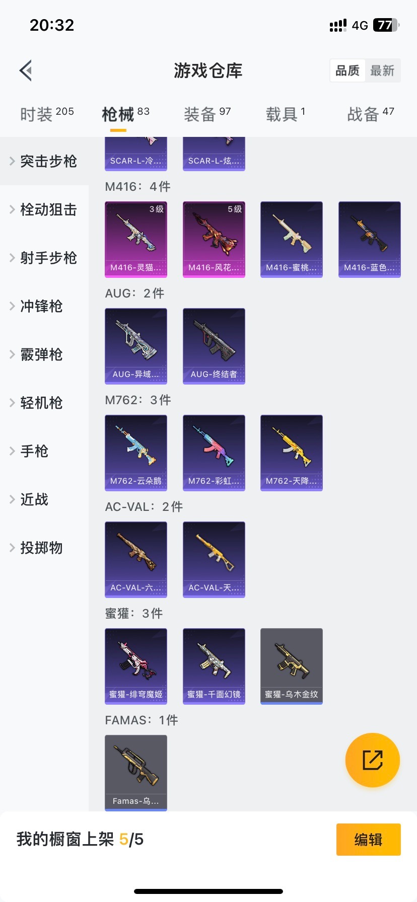 - [11884156]4粉装 7特效枪 1载具 7印记 可二次 可修改实名 优质装备:宾利欧陆GT敞篷(火焰橘),天禅智恒,Vector环太平洋,AKM绿萝繁花,SCAR-L-锦绣绵绵,M416电玩时刻,UMP45量子极限,千金淑猫,GROZA-镜光银凌,Kar98K-巳巳如意 热门装扮:青空秋雨,圣堂之誓,梦魇先生 五级特效枪:五级UMP45-量子极限,五级GROZA-镜光银凌,五级M416-电玩时刻,五级SCAR-L-锦绣绵绵,五级AKM-绿萝繁花,五级Vector-环太平洋 四级特效枪:四级Kar98K-巳巳如意 紫色装扮:SS22特训,SS23特训,幻彩翩翩,妙红点点,龙舌兰冰茶,娇憨猪猪,萌趣咩咩,SS21特训,SS31特训套装,冰川特警,冷焰舞者,SS30特训套装,SS33特训套装,长空猛禽,霓虹街区,风暴特警,荷畔雨呱,缤纷果语,耀眼新星,荣耀,魅力单车,黄色运动,黑色伏地魔,龙的传人,龟仙人,冰河战士,龙魂突击队,蝶变,柠萌假日,海岛探路者,幻影武者,空岛之星,王牌教练,牛气满满,特殊使命,特训学院,小熊娃娃,雏菊兔兔,萝兰蝴蝶,SS29特训,拉斐尔,鹿角斗士,星途旅人,创世·幻影,纯真浪花,热情海星,曼妙人鱼,SS28特训,卖崽青蛙,玉兔迎春,巳巳如意,青团波波,糖糖葫芦,竞技名士,街头风暴,深海梦境,惊鸿侠骨,神气柴柴,懵萌河马,SS24特训(SS24特训套装),SS25特训,锦衣飞扬,湖雨初晴,焰鹰斗篷,幻羽潜行,幽夜迷踪,SS27特训,蝶吟花词,云霞荷露,SS26特训,春光漫游,快闪甜心,智谋强哥,萌黄之夏,光之冒险 优质战备:创世·救赎降落伞,拳皇·狂花道降落伞,星途旅人降落伞,公主华盖飞行器,忍者神龟降落伞,江南烟雨降落伞,千金淑猫降落伞,垂柳戏鸭降落伞,南国舞曲降落伞,拂晓神骑飞行器,炫光之旅降落伞,飒粉甜心降落伞,梦幻火箭降落伞,伏魔团降落伞