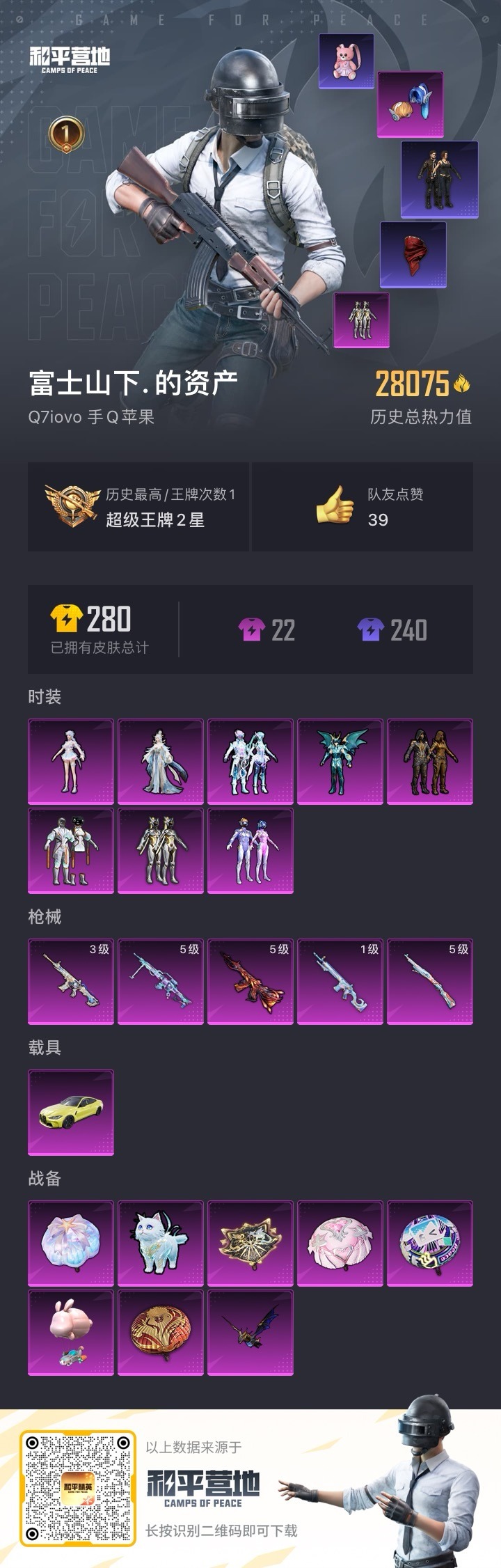 - PX_2087793- 可二次 安卓手Q-13王牌印记-6粉装-7特效枪-0载具-63238热力值-149套装-210枪皮-3卓越印记-2传奇印记 【6粉装】,第五大道,恐龙拽拽,冰霜白皇,彩虹鹿灵,山涧鹿灵,金丰海韵, 【7特效枪】,AKM-绿萝繁花-5级 SCAR-L-锦绣绵绵-5级 SCAR-L-童趣迷兔-7级 M416-心之恋语-7级 AUG-暖羊咩咩-5级 Kar98K-巳巳如意-5级
