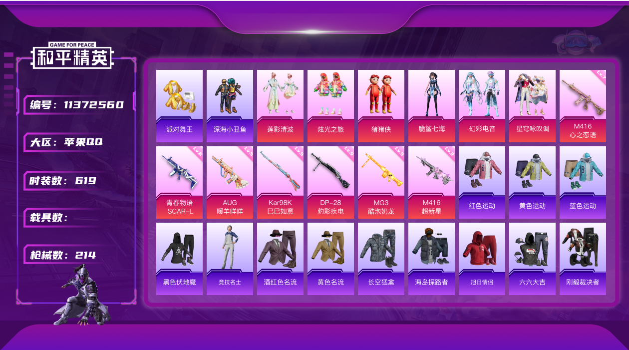 [11372560]6粉装 7特效枪 15印记 可二次 可修改实名 身法装备:舞王派对(派对舞王、小金鞋),暗影哥特(红眼罩),8号机(新粉螳螂),Mark.06(新蓝螳螂) 优质装备:舞王派对(派对舞王、小金鞋),M416心之恋语,SCAR-L青春物语,M416超新星,MG3酷泡奶龙,七级M416-心之恋语,脆鲨七海,AUG-暖羊咩咩,星穹咏叹调,幻彩电音,Kar98K-巳巳如意 热门装扮:炫光之旅,莲影清波,猪猪侠,深海小丑鱼,派对舞王(小金鞋) 稀有枪皮:DP-28-豹影疾电 六级特效枪:六级SCAR-L-青春物语 五级特效枪:五级Kar98K-巳巳如意,五级DP-28-豹影疾电,五级AUG-暖羊咩咩,五级MG3-酷泡奶龙 三级特效枪:三级M416-超新星 紫色装扮:田园牧歌,轻风白浪,SS22特训,日冕精灵,SS23特训,娇憨猪猪,灵幻魔术师,萌趣咩咩,SS21特训,SS31特训套装,SS2特训,六六大吉,冰川特警,刚毅裁决者,午夜朋克,旭日情侣,极速光影,SS30特训套装,云朵鹅,彩虹兔,雪绒豹,SS33特训套装,顶瓜瓜,诡诞巡游,混沌火种,SS20特训,SS13特训,SS14特训,SS19特训,粉团憨憨,都市漫游者,酒红色名流,酷萌兔限定,野性战心,长空猛禽,霓虹街区,霓虹闪烁,荷畔雨呱,缤纷果语,耀眼新星,苍穹猎鹰,荣耀,蓝彩潮人,蓝色运动,街头潮人,魅力单车,黄色名流,黄色运动,黑色伏地魔,龙的传人,龟仙人,冰河战士,龙魂突击队,蝶变,香桃花海,熔岩游骑兵连帽夹克,沙漠毒蛇,极地朋克,柠萌假日,派对绅士,海岛探路者,海滨突袭者,涂山之恋,深蓝色名流,清新柠檬,坚韧舞者,战地菁英,绮丽涂鸦,甜蜜菠萝,疯狂小兔子,破蛋小黄鸡,甜蜜告白,空岛之星,红色运动,王牌教练,牛气冲天,灰色格斗者,燃烧卡路里,特战英豪,狂沙舞者,小熊娃娃,雏菊兔兔,萝兰蝴蝶,SS29特训,星途旅人,纯真浪花,热情海星,曼妙人鱼,SS28特训,8号机(新粉螳螂),Mark.06(新蓝螳螂),异域银装,鱼渊荷华,玉兔迎春,燕燕于飞,巳巳如意,海琴烟,俏兔智灵,青团波波,糖糖葫芦,棉花软糖,竞技名士,摩登魅猫,暗影哥特(红眼罩),街头风暴,情公主,青芒树下,果汁能量,惊鸿侠骨,甜梦熊熊,神气柴柴,懵萌河马,SS24特训(SS24特训套装),SS25特训,绝对偶像,锦衣飞扬,焰鹰斗篷,幻羽潜行,幽夜迷踪,S