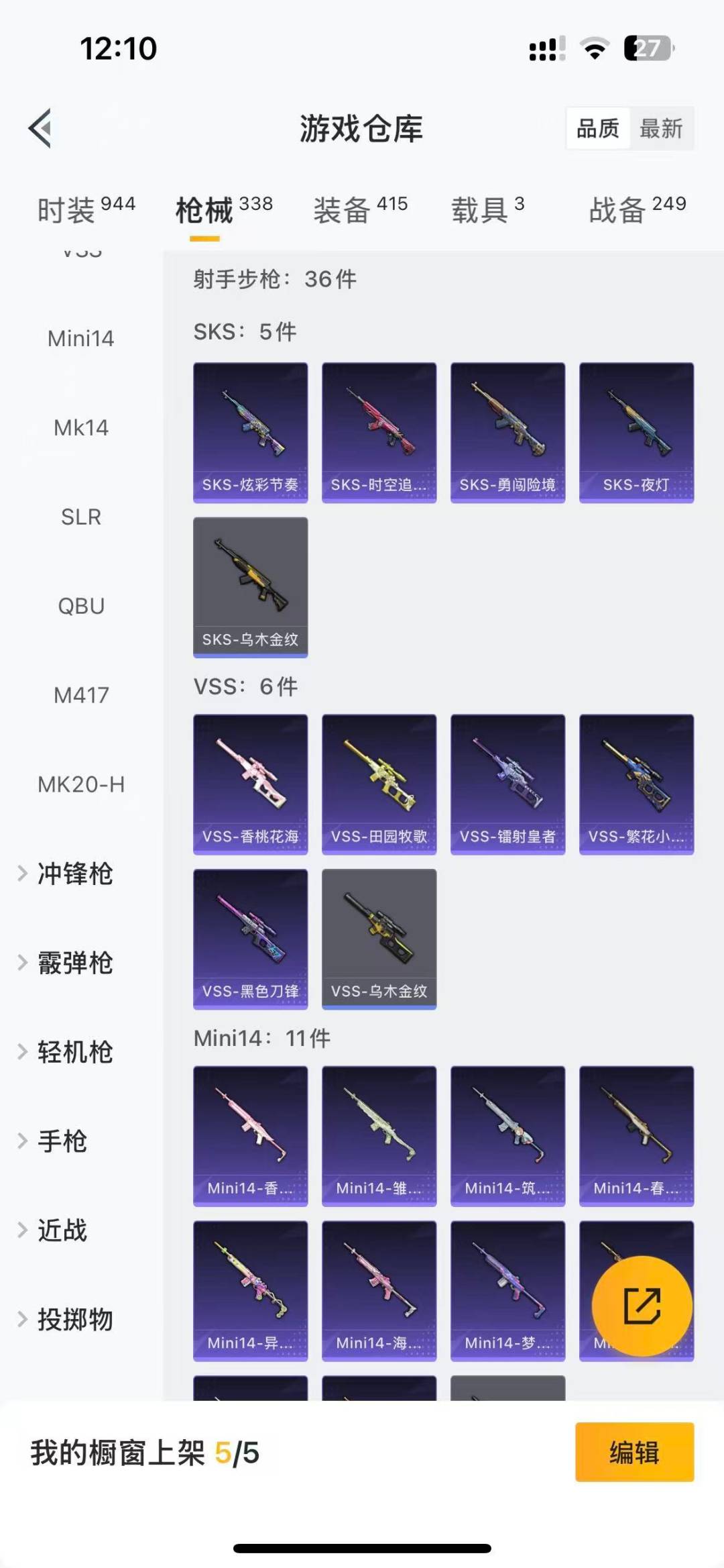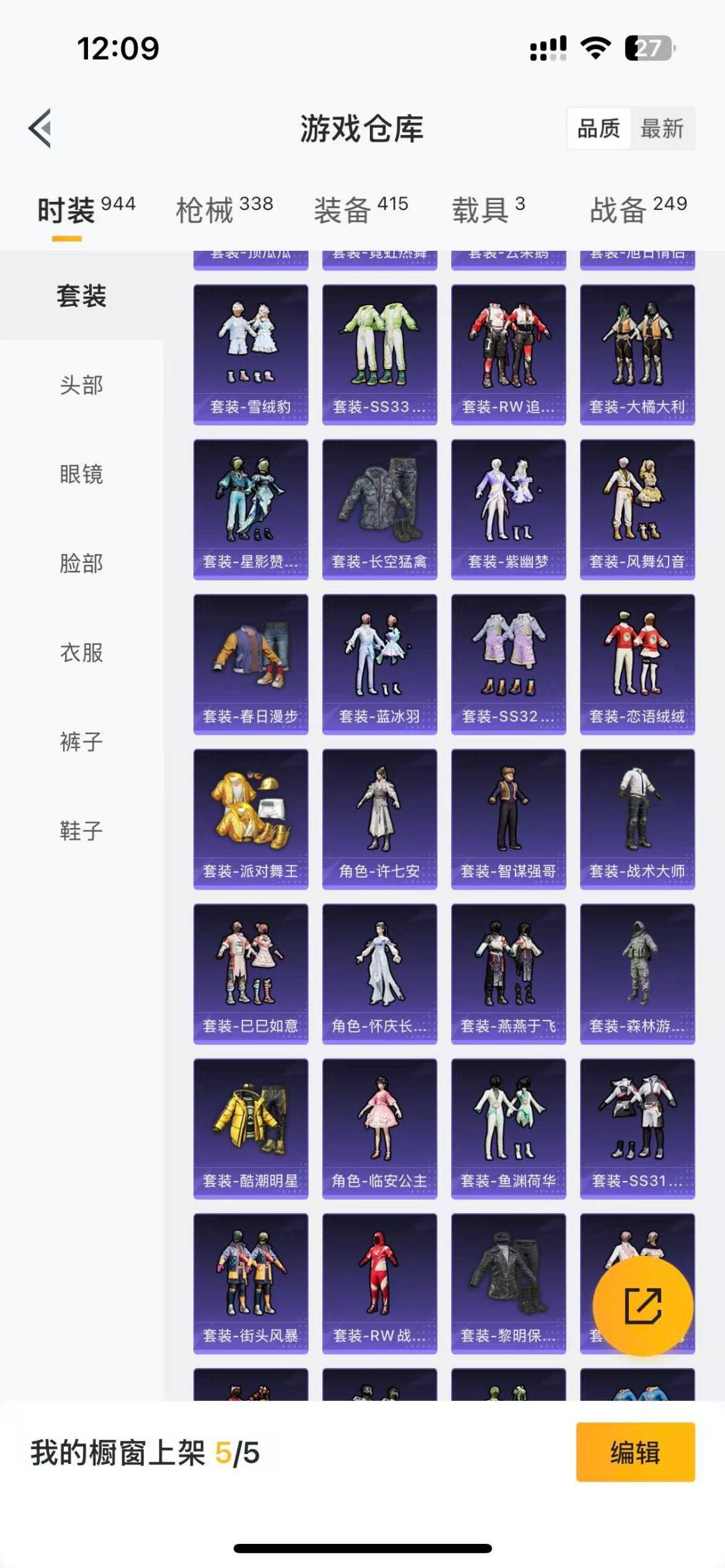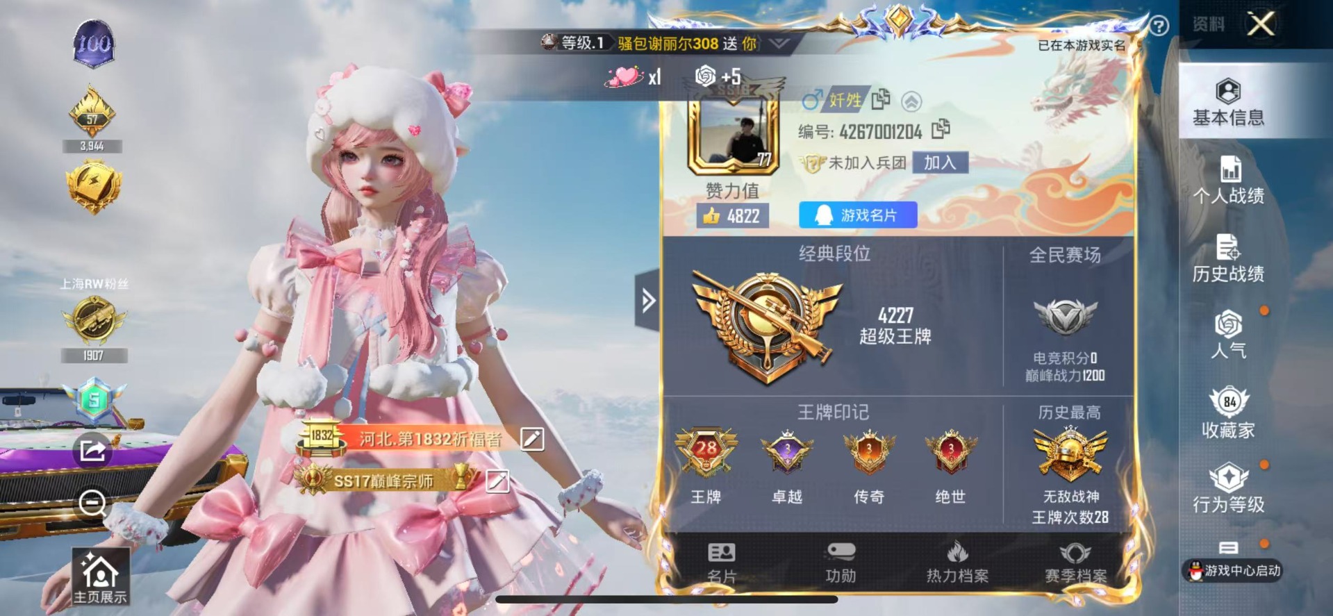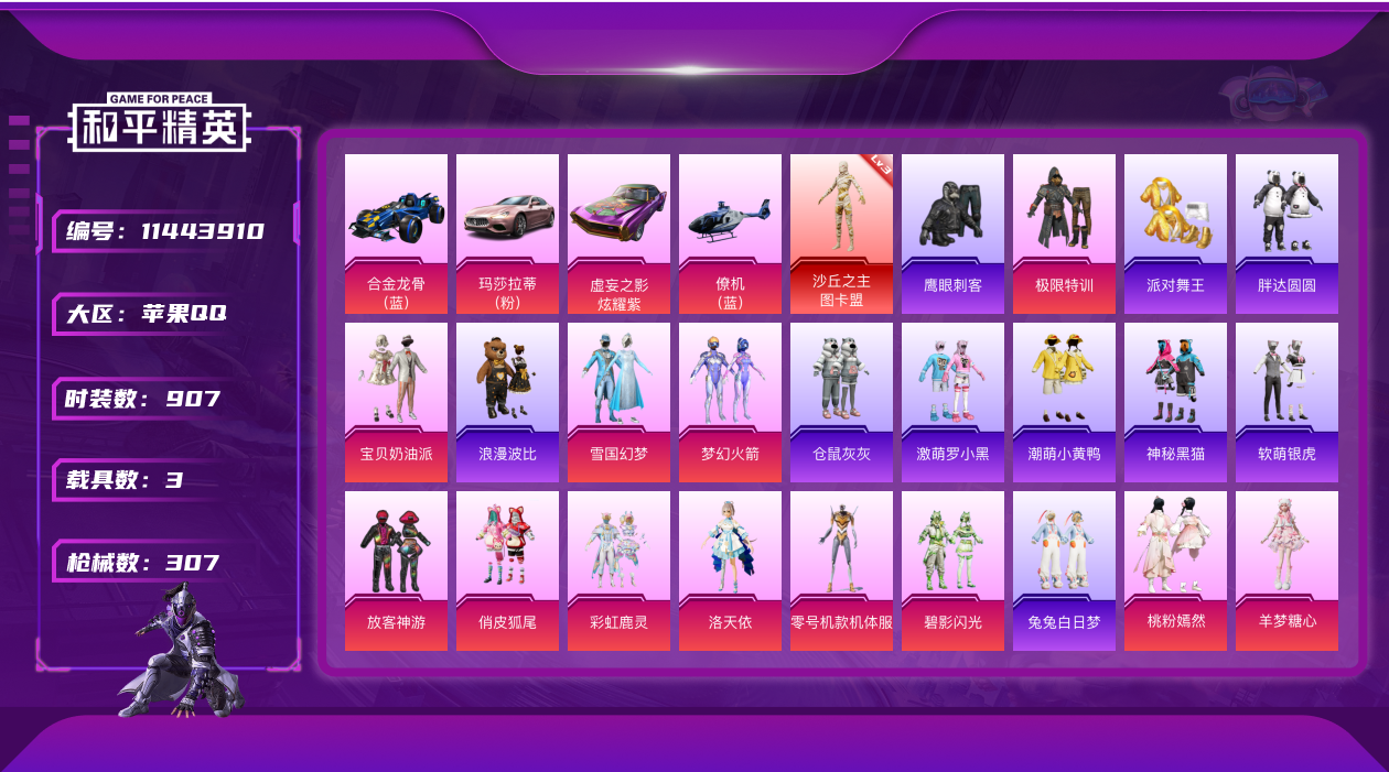 [11443910]1红装 12粉装 12特效枪 3载具 28印记 可二次 可修改实名 身法装备:舞王派对(派对舞王、小金鞋),零号机款机体服(黄螳螂),巡查衣(绝对防御上衣),萌熊伴侣背包(粉熊背包) 优质装备:沙丘之主-图卡盟(黄金木乃伊),三级沙丘之主-图卡盟(3级黄金木乃伊),雪国幻梦(冰雪女王),虚妄之影(炫耀紫),零号机款机体服(黄螳螂),玛莎拉蒂Ghibli(粉),合金龙骨(蓝),巡查员衣服(绝对防御上衣),九级SCAR-L-天蓬元帅(满级天蓬元帅SCAR-L),巡查衣(绝对防御上衣),舞王派对(派对舞王、小金鞋),萌熊伴侣背包(粉熊背包),MG3洛神天依,AKM炫紫旋律,M416心之恋语,梦幻火箭(新101)(新火箭少女101粉色套装),极限特训,宝贝奶油派,放客神游,俏皮狐尾,洛天依,GROZA焦糖拿铁,UMP45启明星,SCAR-L天蓬元帅,P90沙丘之主,七级GROZA-焦糖拿铁,七级M416-心之恋语,七级AKM-炫紫旋律,M416墨龙九天,破片手榴弹秋玉花灯,七级破片手榴弹秋玉花灯,桃粉嫣然,AUG-圣斗士星矢,七级AUG-圣斗士星矢,羊梦糖心,Kar98K-巳巳如意 热门装扮:彩虹鹿灵,碧影闪光,兔兔白日梦,神秘黑猫,软萌银虎,胖达圆圆,激萌罗小黑,潮萌小黄鸭,仓鼠灰灰,鹰眼刺客,浪漫波比,派对舞王(小金鞋) 载具:空客H135-蔚蓝之翼 稀有枪皮:DP-28-豹影疾电 六级特效枪:六级UMP45-启明星 五级特效枪:五级Kar98K-巳巳如意,五级DP-28-豹影疾电,五级MG3-洛神天依 三级特效枪:三级M416-墨龙九天,三级P90-沙丘之主 紫色装扮:田园牧歌,轻风白浪,SS22特训,SS23特训,幻彩翩翩,灵蜜圈圈,妙红点点,SS21特训,紫芒星,SS31特训套装,SS2特训,SS3特训,SS5特训,人气偶像,冰原使者,,冰川特警,凛冬战士,北国孤狼,霓虹热舞,旭日情侣,SS30特训套装,云朵鹅,彩虹兔,雪绒豹,SS33特训套装,顶瓜瓜,诡诞巡游,混沌火种,SS20特训,青春冒险家,潮流游乐家,SS15特训,时空追击者,暴风机械师,SS16特训,爆裂葡萄,银白舞王,SS13特训,治愈之星,迅捷之星,科技之星,SS14特训,怪笑疯兔,萌趣颜团子,特种颜团子,灵绣,飞驰魅影,音速流光,SS19特训,军刀雅典娜,豚鼠丹丹,吉莉礼服,电音精灵,天籁歌