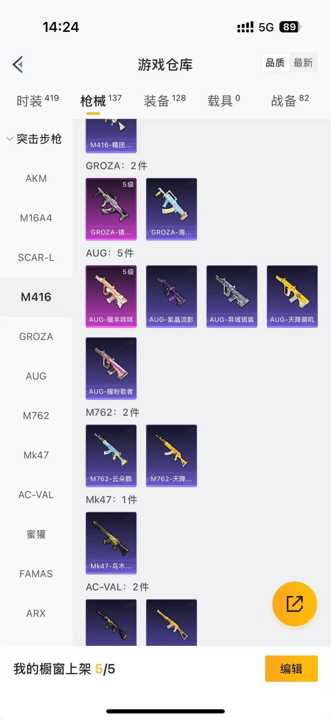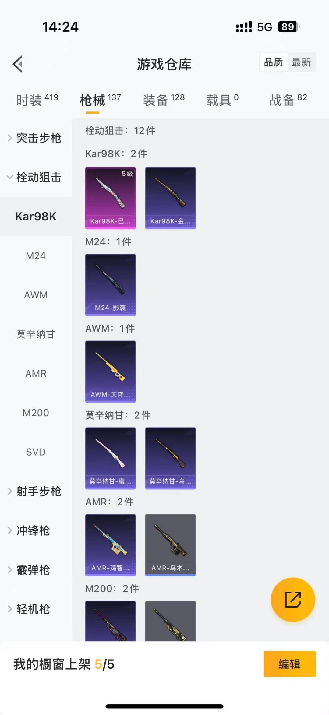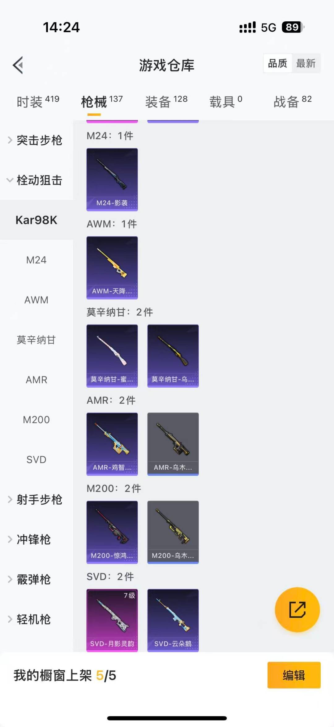 M416-电玩时刻,GROZA-镜光银凌,AUG-暖羊咩咩,Kar98K-巳巳如意,SVD-月影灵韵
