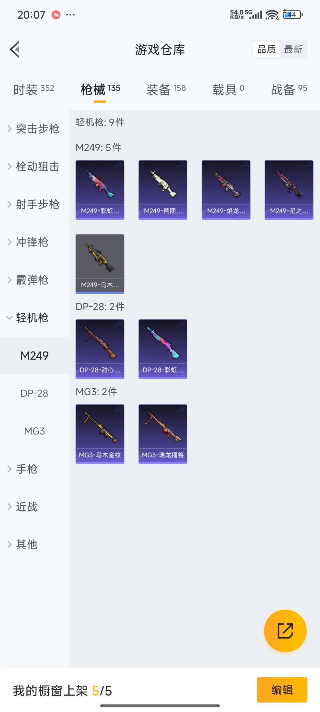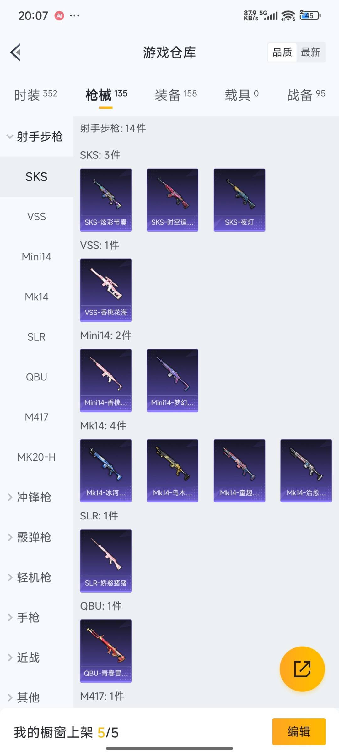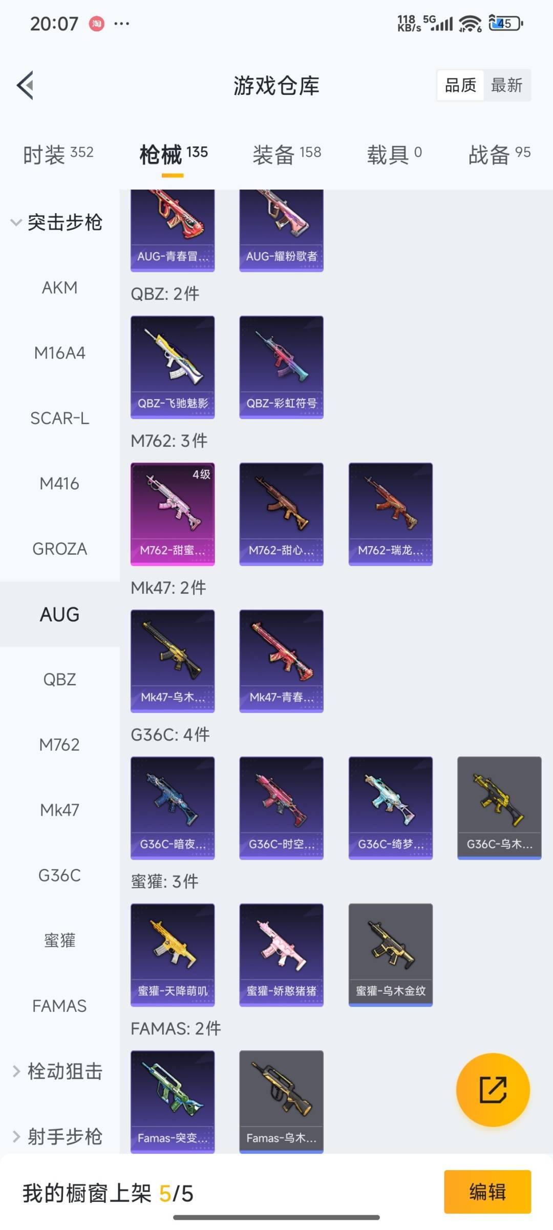 SCAR-L-梦幻火箭,M416-五爪金龙,M416-心之恋语,AUG-星之彼岸,M762-甜蜜誓约,Kar98K-巳巳如意,UZI-绮梦青鸾