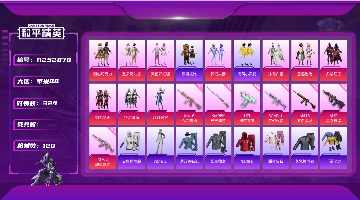 [11252878]10粉装 7特效枪 13印记 可二次 可修改实名 战神框 优质装备:甜心巧克力 热门装扮:梦幻火箭(新101)(新火箭少女101粉色套装),天使彩虹糖,宝贝奶油派,童趣迷兔,炙焰红王,冰霜白皇,焰龙焚天,吟月归客,银龙傲海,潮萌小黄鸭,浪漫波比 稀有枪皮:Kar98K-巳巳如意,M416五爪金龙,M416心之恋语,SCAR-L梦幻火箭,AUG星之彼岸,M762甜蜜誓约,UZI绮梦青鸾 七级特效枪:七级M416-心之恋语 五级特效枪:五级Kar98K-巳巳如意,五级UZI-绮梦青鸾 四级特效枪:四级M762-甜蜜誓约,四级SCAR-L-梦幻火箭,四级M416-五爪金龙,四级AUG-星之彼岸 紫色装扮:萌趣咩咩,SS20特训,SS21特训,娇憨猪猪,暖心熊熊,灵公主,SS30特训套装,SS31特训套装,SS33特训套装,旭日情侣,顶瓜瓜,光影梦想家,星梦畅游,星河入梦,梦起落英,青春冒险家,潮流游乐家,SS15特训,暗夜傀儡,萌趣颜团子,时空追击者,SS14特训,治愈之星,迅捷之星,科技之星,暴风机械师,飞驰魅影,SS18特训,雪兔飞飞,音速流光,SS19特训,冰川特警,SS16特训,瑞龙福将,团圆交子,SS17特训,虎虎生威吉莉,空岛之星,空投萌叽,缤纷果语,耀眼新星,长空猛禽,冰河战士,龙魂突击队,蝶变,香桃花海,霓虹街区,龙的传人,魅力单车,福星高照,格斗先锋,千禧之恋,吉莉礼服,夏日音浪,甜蜜告白,白色伏地魔,清新柠檬,湖蓝色名流,牛气满满,灰色格斗者,炫蓝之夏,牛气冲天,SS29特训,SS28特训,燕燕于飞,异域银装,鱼渊荷华,玉兔迎春,巳巳如意,竞技名士,街头风暴,SS25特训,SS27特训,日照花林,SS26特训,耀粉歌者,纯白誓言,暗夜契约,SS32特训服(SS32特训套装),智谋强哥,晶辉守护,萌黄之夏 优质战备:闲梦青缨降落伞,甜心宝贝降落伞,梦幻火箭降落伞,梦幻火箭飞行器,甜蜜誓约降落伞,童趣迷兔降落伞,王牌四分卫降落伞,绮梦青鸾降落伞,焰龙焚天降落伞,暗夜玫瑰降落伞