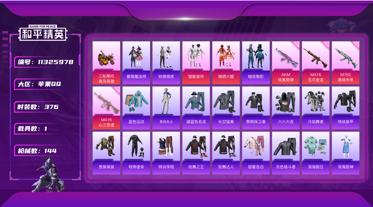 [11325978]2粉装 4特效枪 1载具 10印记 可二次 可修改实名 优质装备:AKM炫紫旋律,M416五爪金龙,M416心之恋语,智能音符,M762激战未来,锦绣火鲤 热门装扮:软萌银虎,蔷薇魔法师,暗夜魅影 载具:鬼马风驰 五级特效枪:五级M762-激战未来,五级Kar98K-伏魔团,五级M416-五爪金龙 四级特效枪:四级M416-心之恋语 紫色装扮:SS22特训,SS21特训,六六大吉,冰川特警,冷焰舞者,SS20特训,青春冒险家,潮流游乐家,SS15特训,鹤发童颜,时空追击者,暴风机械师,SS16特训,快乐星愿,银白舞王,SS13特训,治愈之星,迅捷之星,科技之星,SS14特训,萌趣颜团子,特种颜团子,飞驰魅影,音速流光,SS19特训,吉莉礼服,雪兔飞飞,瑞龙福将,团圆交子,SS17特训,SS18特训,都市漫游者,长空猛禽,耀眼新星,蓝色运动,虎虎生威吉莉,飞行日记,魅力单车,黎明保卫者,朋克治安官,极速红龙,格斗先锋,滨海假日,夏日音浪,幻世战舞者,怒火燎原,湖蓝色名流,滨海厨神,白熊同盟,破晓战魂,神秘领域,甜蜜告白,福星高照,牛气冲天,灰色格斗者,炫蓝之夏,热血青春,牛气满满,特战装甲,特殊使命,特训学院,狂沙舞者,镭射皇者,竞技名士,SS24特训(SS24特训套装),金羽特工,萌主吾皇,摇滚狂鲨,迷域探索者,玲珑飞花,SS8特训,丝绸行者,神秘舞者,粉甜马卡龙,白虎圣者,原初圣火,逆风勇士,SS12特训,韶华初心,辉星之火,纯白誓言,众神之王,智慧之神,SS9特训,舞夜骑士,风华少年志,SS10特训,暗夜契约,机械英豪,机械征服者,SS11特训,萌黄之夏,金耀舞者,蓝调潮人,贵族骑装,街舞达人,街舞之王,海上生明月 优质战备:炫紫旋律降落伞,繁花小夜曲降落伞,飞行器-心之恋语(心之恋语飞行翼),扶摇飞仙降落伞,潮汐统领降落伞,阿狸红降落伞,心之恋语降落伞,香水柠檬降落伞