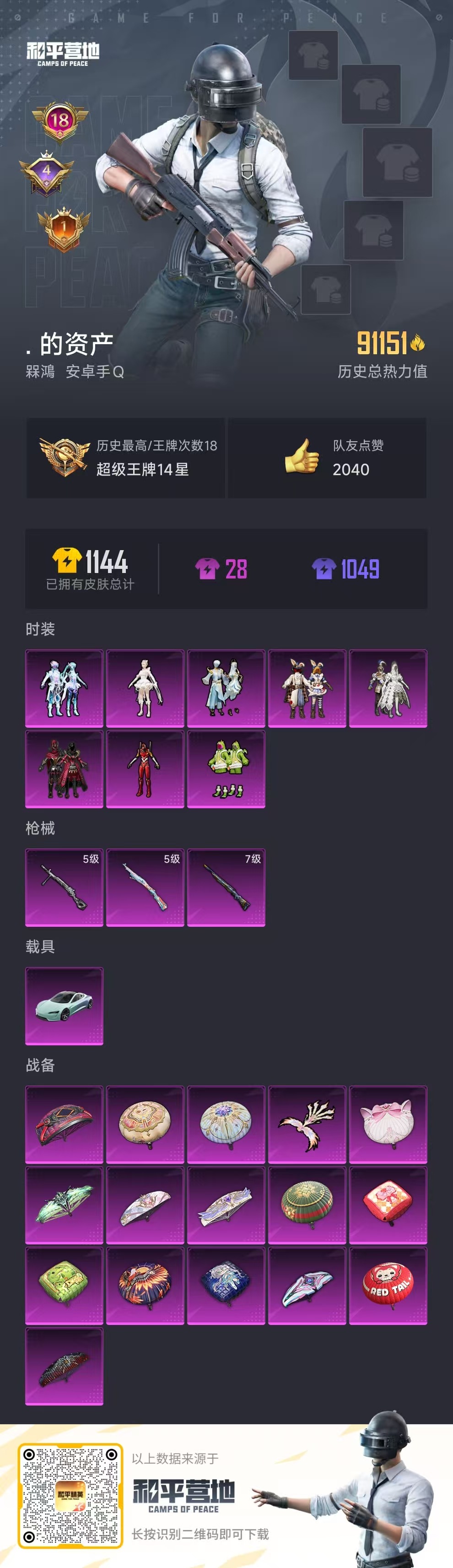 - PX_2030367- 苹果手Q-5王牌印记-3粉装-6特效枪-1载具-32616热力值-69套装-94枪皮-2卓越印记-0传奇印记 【3粉装】,梦幻火箭,千金淑猫,室女星神 【6特效枪】AKM-炫紫旋律-7级 SCAR-L-纯梦嫁纱-5级 SCAR-L-梦幻火箭-1级 GROZA-镜光银凌-5级 AUG-超新星-5级 Kar98K-巳巳如意-5级 【4稀有紫装】,2B战斗服款,暗影哥特,浪漫天