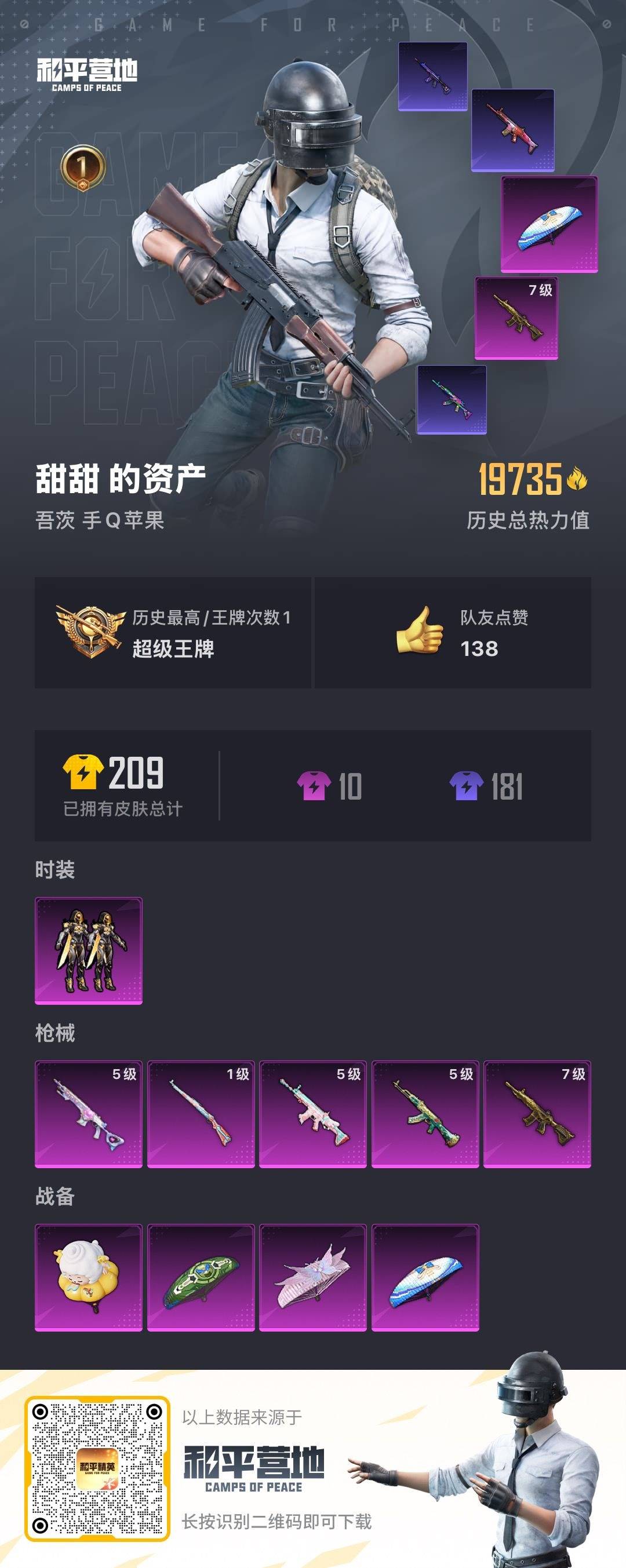 - [9341460]实名: 可修改 时装数: 309 载具数: 2 枪械数: 123 战备数: 73 热门装扮: 洛天依,恐龙拽拽,冰川幽秘,星梦奇缘,智耀战神 载具: 玛莎拉蒂Grecale(薄荷绿),玛莎拉蒂Quattroporte(夜幕蓝) 稀有枪皮: M416五爪金龙,M416心之恋语,Groza香水柠檬,AKM星际浪客,Vector飒粉甜心,AMR鸢尾晶梦,Kar98K-巳巳如意,AUG-暖羊咩咩