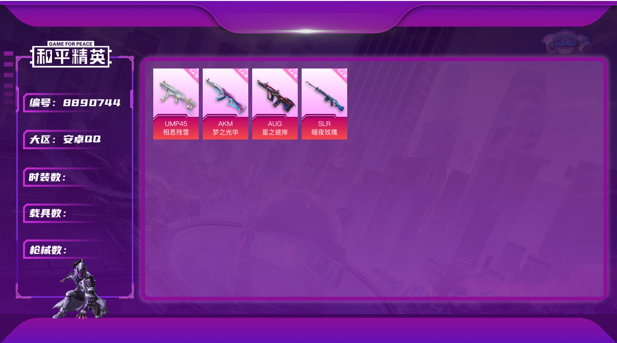 - PX_2061684- 安卓手Q-12王牌印记-16粉装-9特效枪-2载具-85537热力值-209套装-261枪皮-0卓越印记-0传奇印记 【16粉装】,星穹咏叹调,恐龙拽拽,炙焰赤龙,飓风飞鹰,金曜白虎,华贵君王,星之信仰,复仇流浪者,冰炎战车,紫钛骑兵,圣堂之誓,银河战甲,莲影清波,女娲灵识,山涧鹿灵,暗夜鎏金 【9特效枪】AKM-幽焰骑士-3级 M416-风花雪月-7级 Kar98K-巳巳