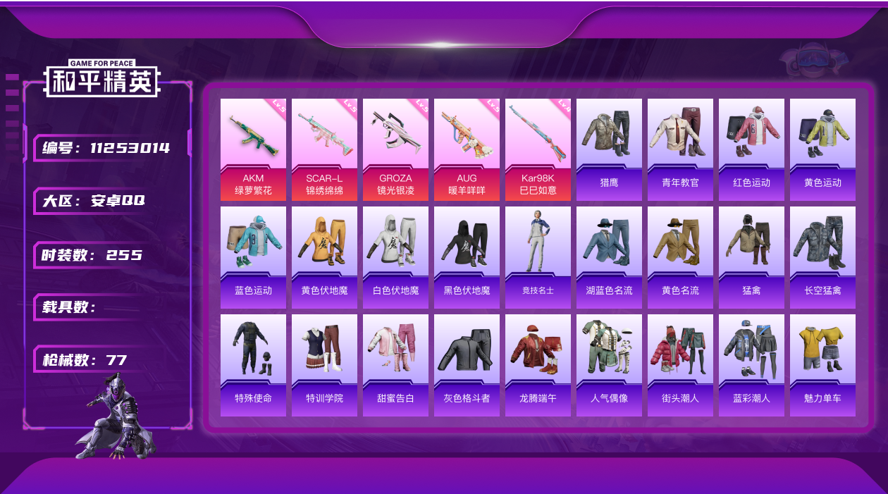 [11253014]5特效枪 3印记 可二次 可修改实名 优质装备:AKM绿萝繁花,SCAR-L-锦绣绵绵,GROZA-镜光银凌,AUG-暖羊咩咩,Kar98K-巳巳如意 五级特效枪:五级GROZA-镜光银凌,五级AUG-暖羊咩咩,五级SCAR-L-锦绣绵绵,五级AKM-绿萝繁花 四级特效枪:四级Kar98K-巳巳如意 紫色装扮:SS23特训,SS21特训,人气偶像,SS31特训套装,SS33特训套装,青春冒险家,潮流游乐家,SS15特训,星梦畅游,萌趣颜团子,特种颜团子,吉莉礼服,长空猛禽,霓虹街区,青年教官,缤纷果语,耀眼新星,蓝彩潮人,蓝色运动,街头潮人,风行保卫者,龙的传人,魅力单车,鹤鸣,黄色伏地魔,黄色名流,黄色运动,黑色伏地魔,龙腾端午,绮丽涂鸦,柠萌假日,深蓝色名流,湖蓝色名流,幻世战舞者,白色伏地魔,破晓战魂,福星高照,空岛之星,竞技达人朋克,红色运动,甜蜜告白,猛禽,灰色格斗者,猎鹰,特殊使命,特训学院,SS28特训,鱼渊荷华,燕燕于飞,竞技名士,惊鸿侠骨,SS25特训,SS24特训(SS24特训套装),锦衣飞扬,SS27特训,SS26特训,春光漫游,快闪甜心,贝斯之夜,玄武圣者,耀粉歌者,冷血极客,忍者信条 优质战备:圣堂之誓降落伞,萌酷奶龙降落伞,银刃赛罗降落伞
