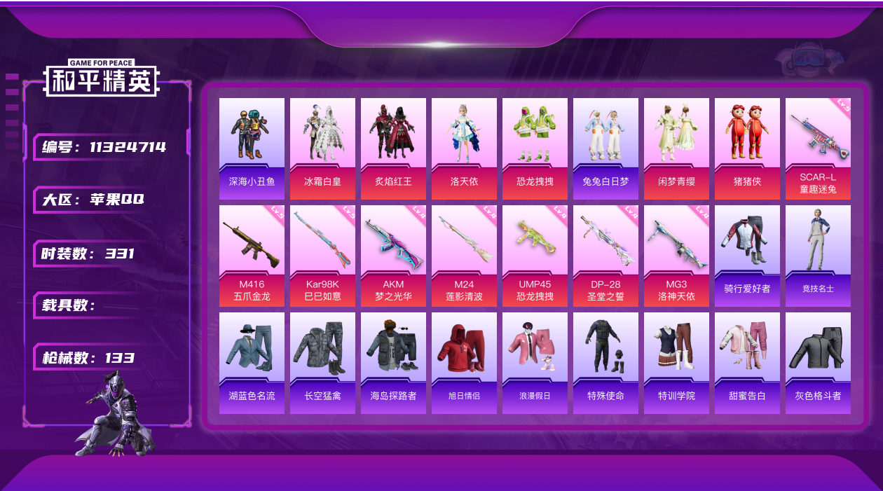 [11324714]6粉装 8特效枪 12印记 可二次 可修改实名 优质装备:MG3洛神天依,M416五爪金龙,SCAR-L童趣迷兔,炙焰红王,冰霜白皇,AKM梦之光华,洛天依,UMP45恐龙拽拽,M24莲影清波,DP-28圣堂之誓,Kar98K-巳巳如意 热门装扮:恐龙拽拽,闲梦青缨,猪猪侠,兔兔白日梦,深海小丑鱼 五级特效枪:五级SCAR-L-童趣迷兔,五级M416-五爪金龙,五级Kar98K-巳巳如意 四级特效枪:四级DP-28-圣堂之誓,四级M24-莲影清波,四级MG3-洛神天依,四级AKM-梦之光华,四级UMP45-恐龙拽拽 紫色装扮:SS22特训,SS23特训,幻彩翩翩,灵蜜圈圈,妙红点点,香榭午后,SS21特训,浪漫假日,SS31特训套装,霓虹热舞,旭日情侣,SS30特训套装,云朵鹅,彩虹兔,雪绒豹,SS33特训套装,青涩时光,顶瓜瓜,SS13特训,SS14特训,豚鼠丹丹,雪兔飞飞,电音精灵,天籁歌者,魔力冰咖,都市漫游者,长空猛禽,霓虹街区,缤纷果语,荣耀,街头潮人,骑行爱好者,鹤鸣,龙的传人,龟仙人,香桃花海,极地朋克,柠萌假日,沙漠兵团,海岛探路者,涂山之恋,坚韧舞者,湖蓝色名流,白熊同盟,甜蜜告白,空岛之星,王牌教练,灰色格斗者,特殊使命,特训学院,SS29特训,星途旅人,SS28特训,异域银装,巳巳如意,竞技名士,绒宝小鹅,银尘,春野茶蘼,惊鸿侠骨,甜梦熊熊,神气柴柴,懵萌河马,SS24特训(SS24特训套装),绚紫流光,幽秘魅影,SS25特训,绝对偶像,元气发射,锦衣飞扬,湖雨初晴,SS27特训,忠真马岱,晨曦薄雾,SS26特训,春光漫游,快闪甜心,贝斯之夜,闪耀星光,玲珑飞花,SS32特训服(SS32特训套装),青玉碎影,绯格组合,萌黄之夏 优质战备:圣堂之誓降落伞,星途旅人降落伞,龙行天下降落伞,莲影清波降落伞,恐龙拽拽降落伞,千金淑猫降落伞,沙丘之主降落伞,绯穹魔姬降落伞,未来歌姬降落伞,炎氏战神飞行翼,粉樱探戈降落伞,炫光之旅降落伞,星之信仰降落伞,童趣迷兔降落伞,洛神天依降落伞
