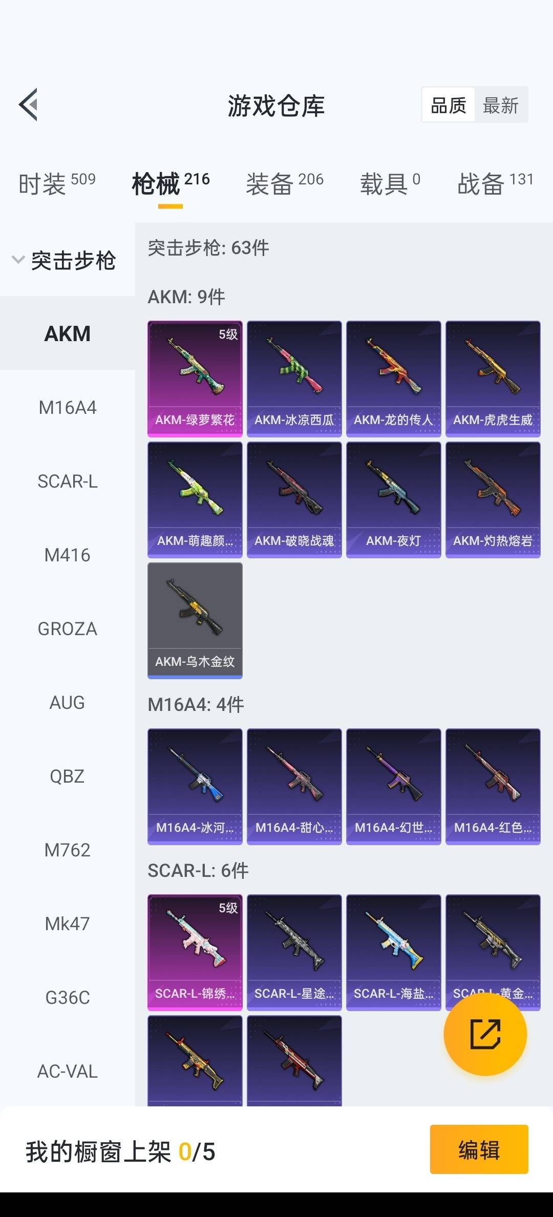 AKM-绿萝繁花,SCAR-L-锦绣绵绵,M416-电玩时刻,GROZA-镜光银凌,AUG-暖羊咩咩,Kar98K-巳巳如意,PKM-守护天翼