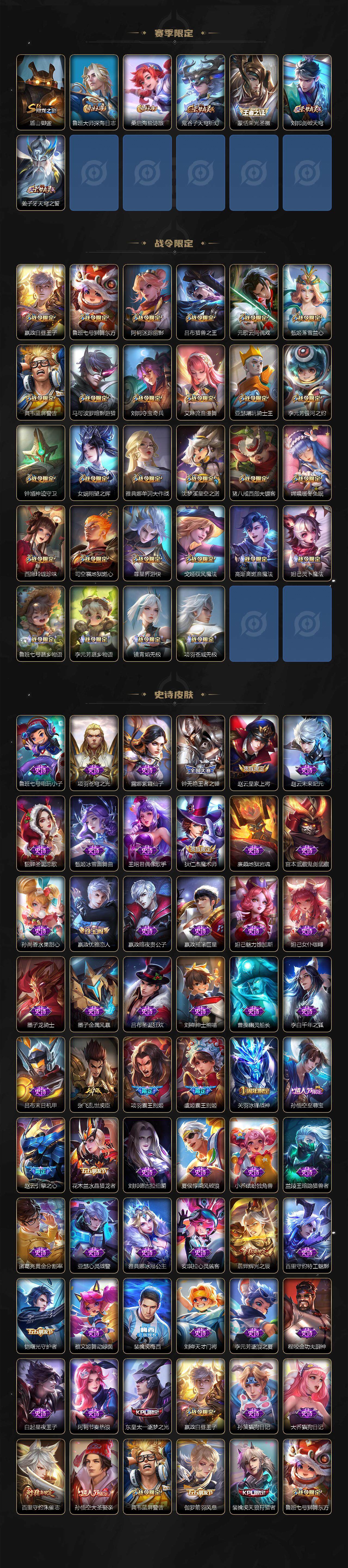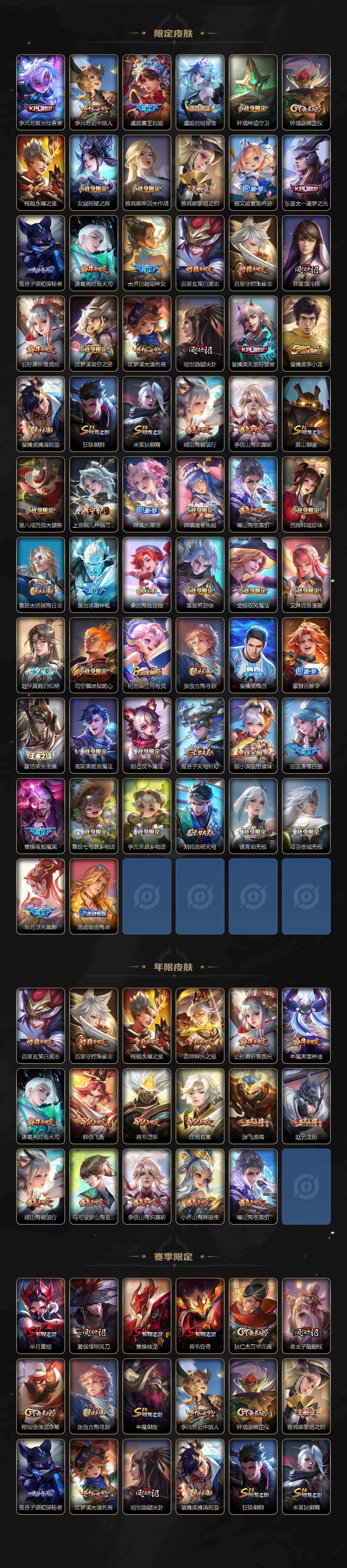 【限定皮肤】:姜子牙天穹之誓,李白谪仙醉月,狄仁杰阴阳师,小乔山海琳琅生,赵云皇家上将,赵云引擎之心,赵云龙胆,嬴政优雅恋人,嬴政白昼王子,鲁班七号狮舞东方,庄周玄嵩,高渐离玩趣恶龙,阿轲迷踪丽影,钟无艳王者之锤,孙膑天狼运算者,芈月重明,吕布猎兽之王,元歌云间偶戏,夏侯惇朔风刀,甄姬落雪兰心,曹操烛龙,典韦穷奇,典韦蓝屏警告,典韦岱宗,马可波罗暗影游猎,马可波罗山海玄木吟,马可波罗妄想实况,狄仁杰魔术师,狄仁杰万华元夜,狄仁杰神器狴犴令,项羽海滩派对,项羽霸王别姬,老夫子醍醐杖,关羽冰锋战神,程咬金演武夺筹,刘邦夺宝奇兵,韩信飞衡,橘右京枫霜尽,亚瑟潮玩骑士王,孙悟空至尊宝,孙悟空大圣娶亲,孙悟空零号赤焰,孙悟空齐天大圣,牛魔御旌,牛魔奔雷神使,后羿辉光之辰,张飞虎魄,李元芳银河之约,李元芳匿光侦查者,李元芳云中旅人,虞姬霸王别姬,虞姬启明星使,钟馗神迹守卫,钟馗驱傩正仪,杨戬永曜之星,女娲朔望之晖,雅典娜单词大作战,雅典娜黎明之约,蔡文姬繁星吟游,东皇太一逐梦之光,鬼谷子原初探秘者,诸葛亮时雨天司,大乔白鹤梁神女,百里玄策白虎志,百里守约朱雀志,弈星混沌棋,公孙离祈雪灵祝,沈梦溪星空之诺,沈梦溪大漠名商,明世隐疑决卦,裴擒虎天狼狩猎者,裴擒虎李小龙,裴擒虎擒涛扼浪,狂铁御狮,米莱狄御霄,瑶山海碧波行,李信山海炽霜斩,盾山御