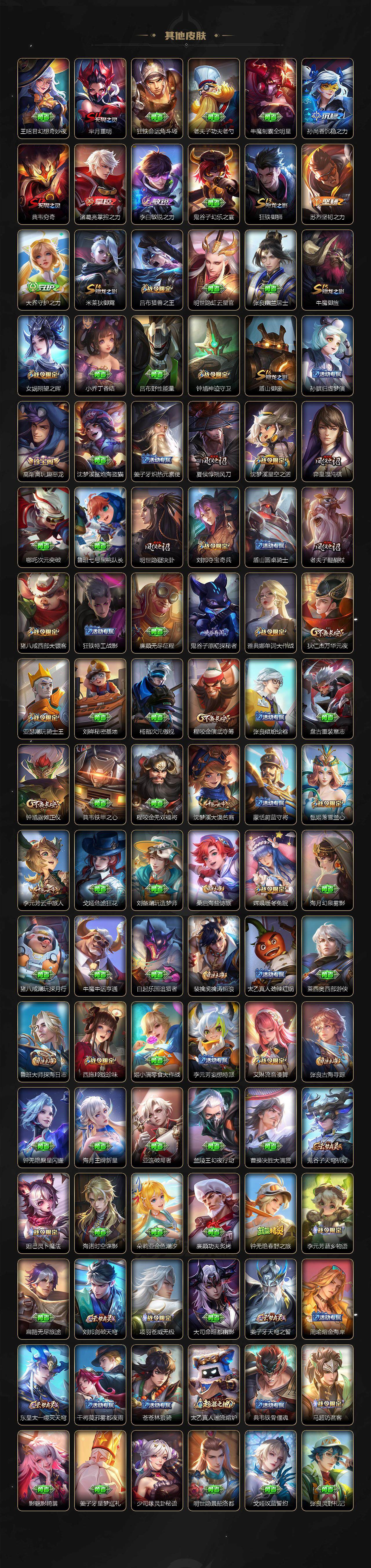 曹操烛龙,芈月重明,典韦穷奇,狂铁御狮,米莱狄御霄,牛魔御旌,盾山御銮,夏侯惇朔风刀,明世隐疑决卦,老夫子醍醐杖,鬼谷子原初探秘者,狄仁杰万华元夜,程咬金演武夺筹,钟馗驱傩正仪,吕布猎兽之王,嬴政白昼王子,女娲朔望之晖,典韦蓝屏警告,钟馗神迹守卫,鲁班七号狮舞东方,沈梦溪星空之诺,李元芳银河之约,刘邦夺宝奇兵,马可波罗暗影游猎,元歌云间偶戏,弈星混沌棋,沈梦溪大漠名商,李元芳云中旅人,桑启海盐诗旅,裴擒虎擒涛扼浪,鲁班大师探海日志,张良古海寻踪,项羽苍威无极,镜青焰无极