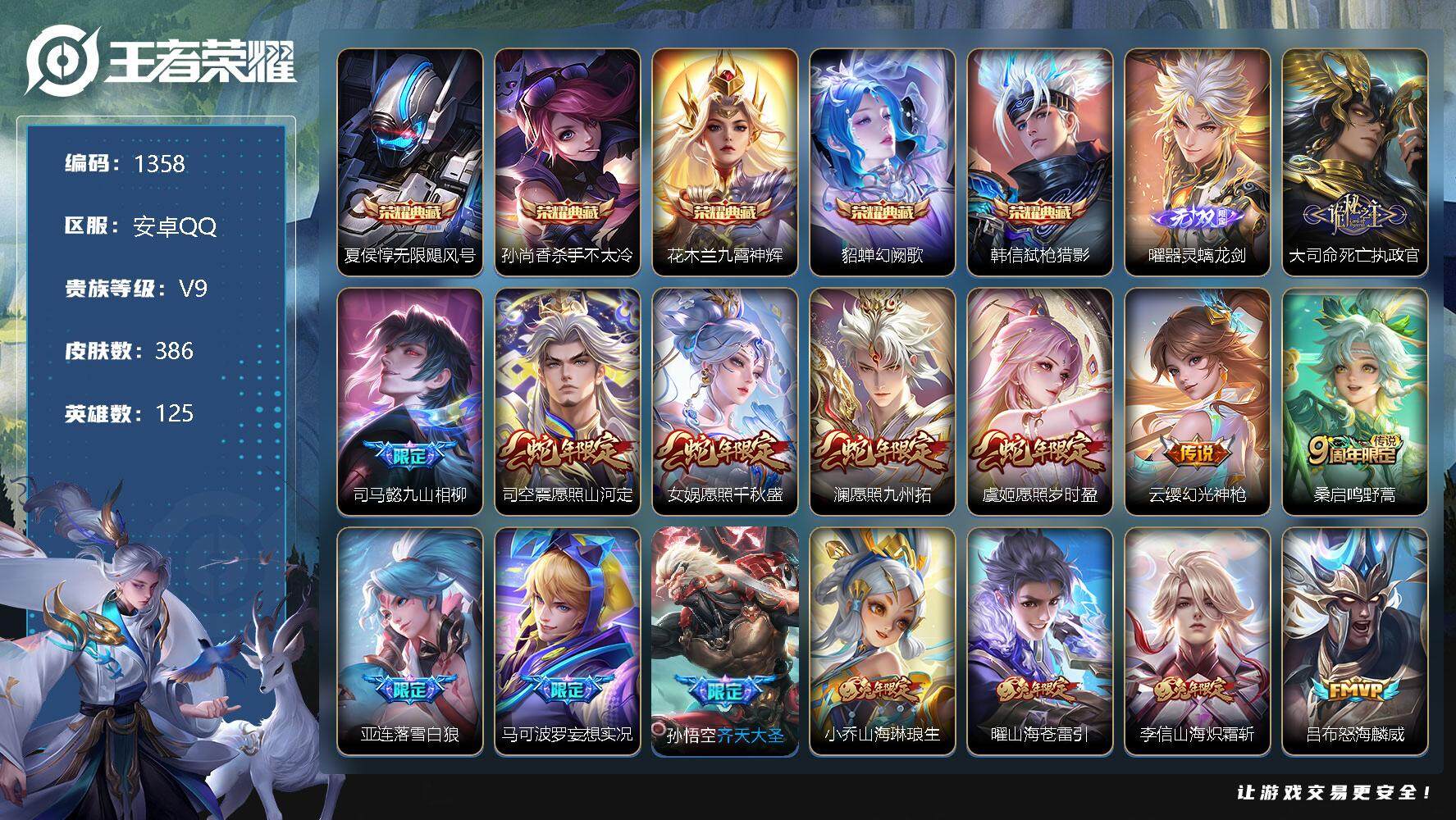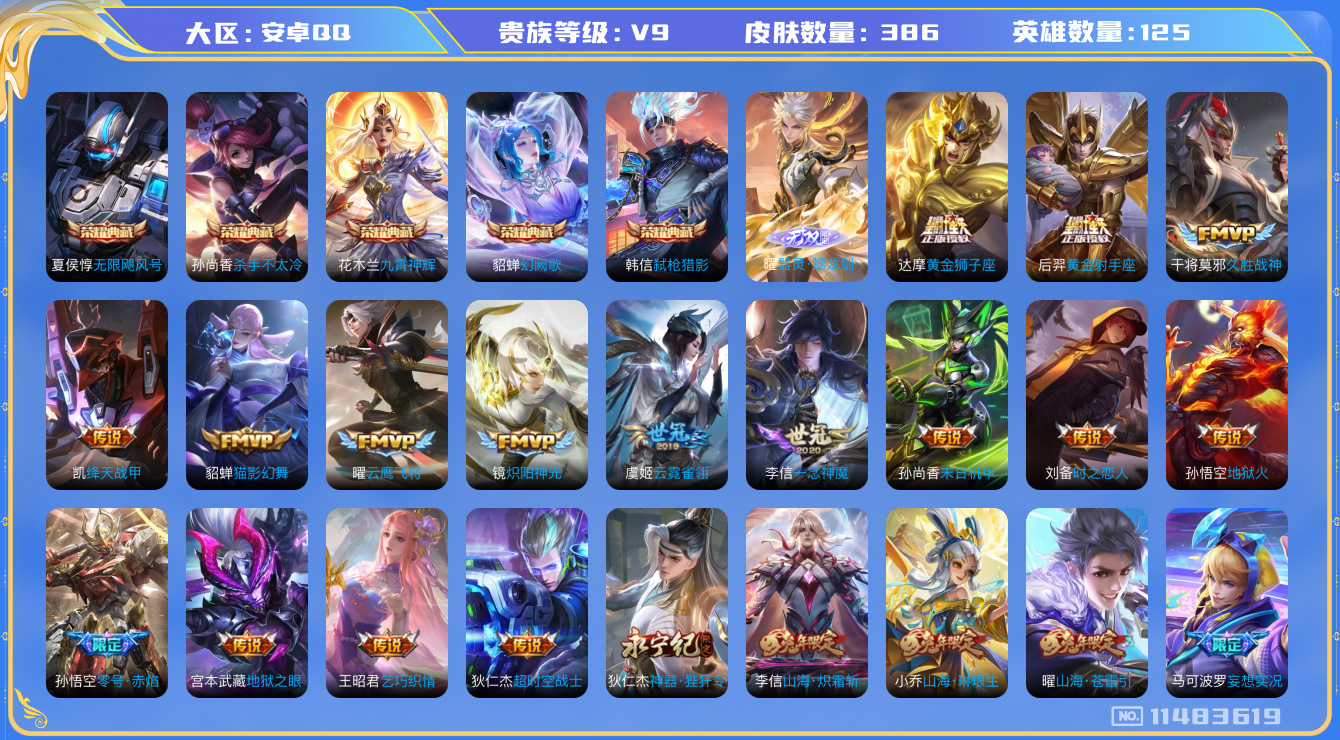 [11483619]【商品标题】:安卓Q-V9-最强王者段位-125英雄-386皮肤-5典藏-0珍品无双-1无双-0珍品传说-39传说-120史诗