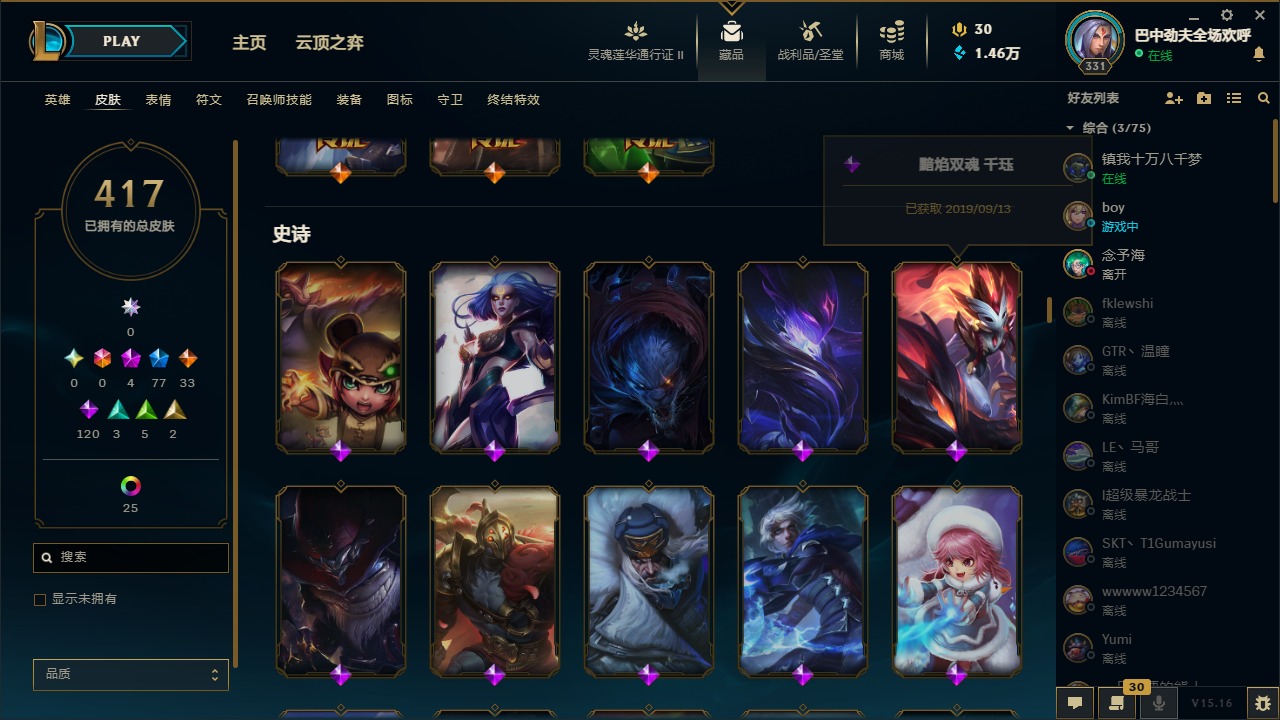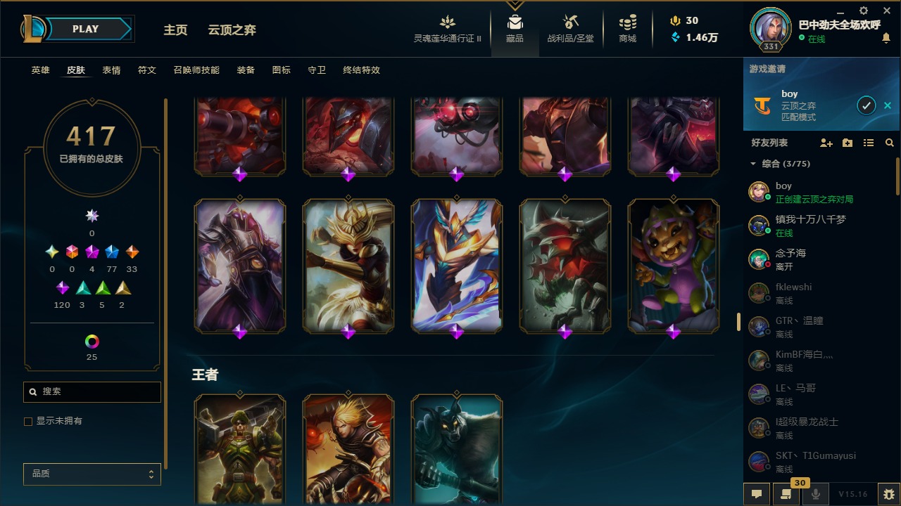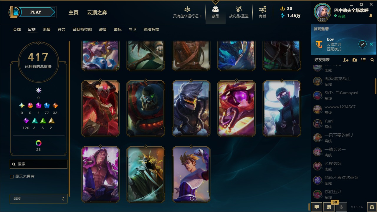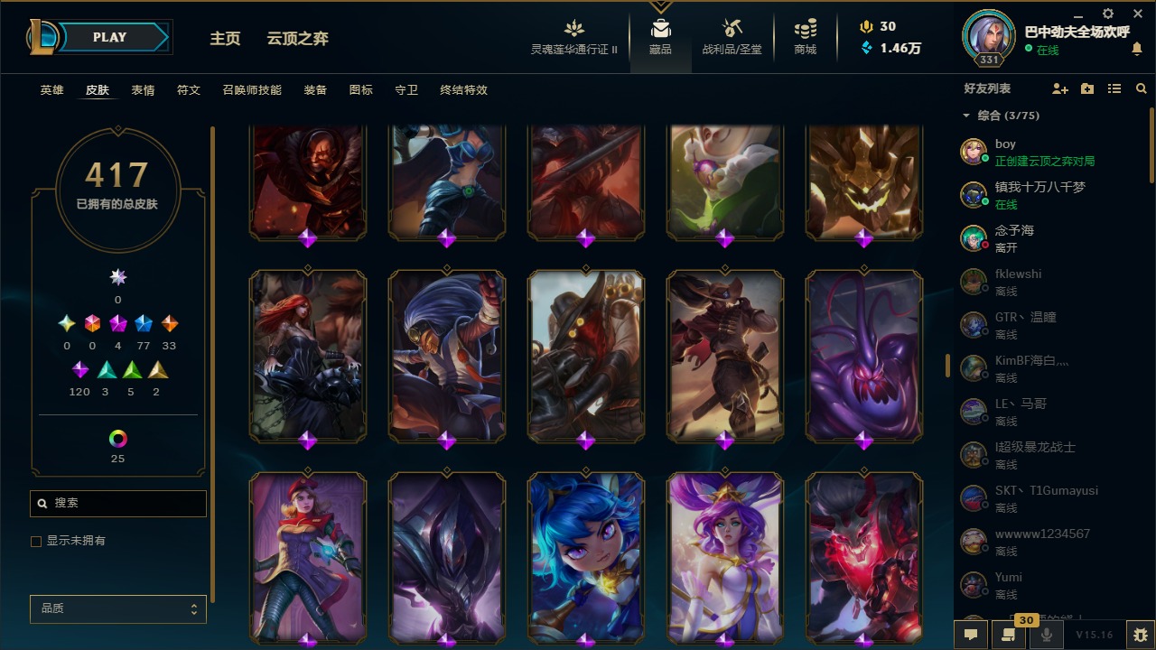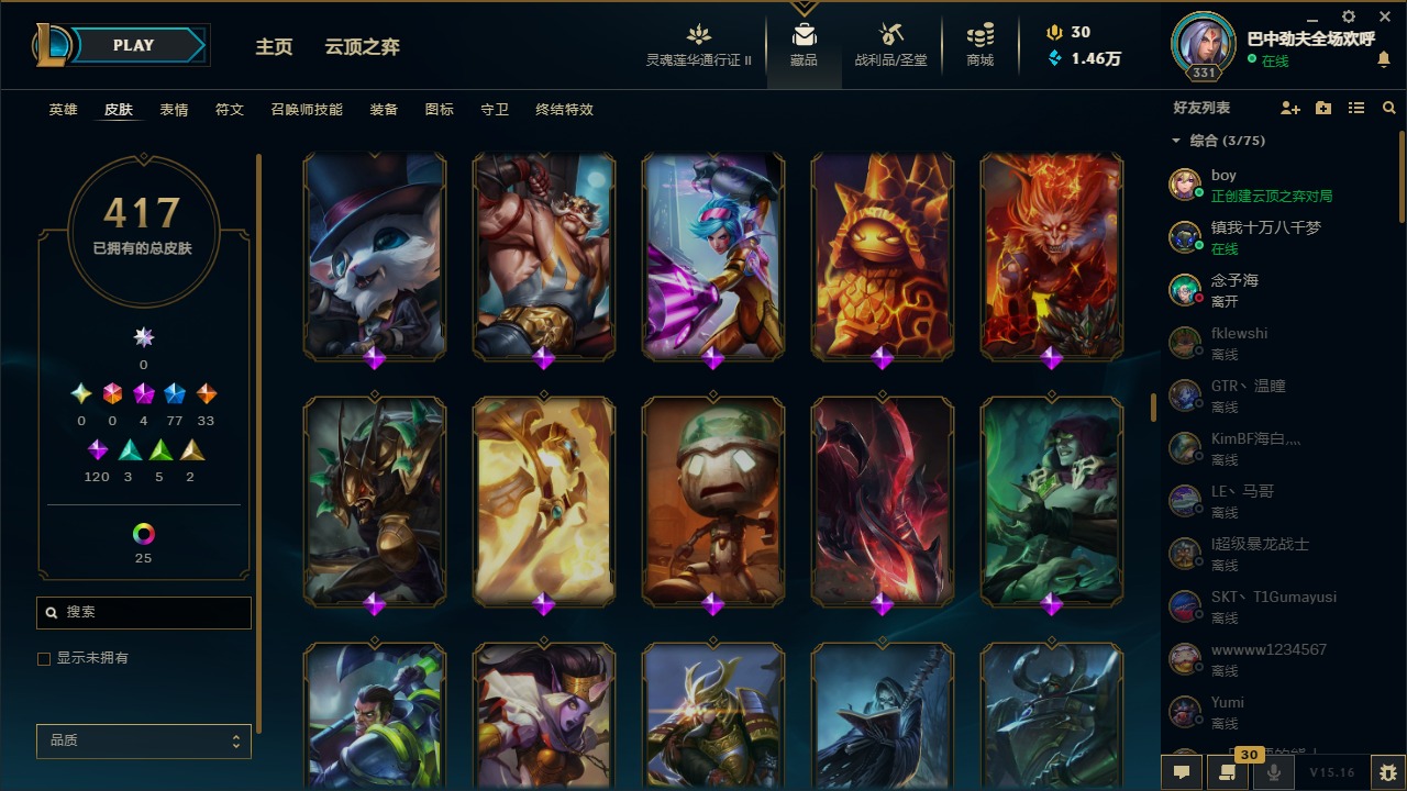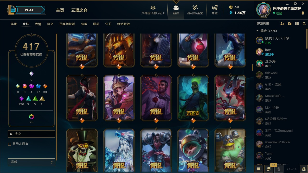 [11471349]可二次 可修改实名 4神话 8臻彩 77限定 33传说 120史诗 417皮肤 41炫彩 171英雄 铂金 皮肤:至臻 神龙尊者 炎龙瑟提,王国机神苍狼 瑟提,太空律动 “创乐之神” 奥恩,雷霆领主 奥恩,晨星之翎 洛,冰雪游神 巴德,腥红之月 卡莉丝塔,灌篮高手 艾翁,糖果之王 艾翁,上古战魂 雷克塞,虚空使者 俄洛伊,腥红之月 锤石,冠军典狱长 锤石,司马懿 仲达,星际之门 阿兹尔,海皇姬 娜美,鲛妮座人 娜美,胜利之剑 亚托克斯,仲裁圣骑 亚托克斯,源计划:裁决 蔚,虎痴之拳 蔚,霓虹杀拳 蔚,SKT T1 艾克,任性学霸 艾克,爵士 克烈,胜利枪神 卢锡安,纳财大帝 塔姆,海牛大大 塔姆,星之守护者 金克丝,神龙烈焰 金克丝,黯焰双魂 千珏,腥红之月 烬,西部牛仔 烬,糖果大战 布隆,布隆·狮心,猛虎 布隆,屠龙勇士 布隆,源代码 卡蜜尔,弗雷尔卓德 塔莉垭,这货不是维克兹,苍穹之光 维克兹,战地机甲 维克兹,源计划:风 亚索,西部牛仔 亚索,邪恶魔人 扎克,狂狮 纳尔,萌侦探 喵尔摩斯,最后一只恐龙 纳尔,魔女 婕拉,驯龙女巫 婕拉,SKT T1 婕拉,鬼影森森 婕拉,野火之藤 婕拉