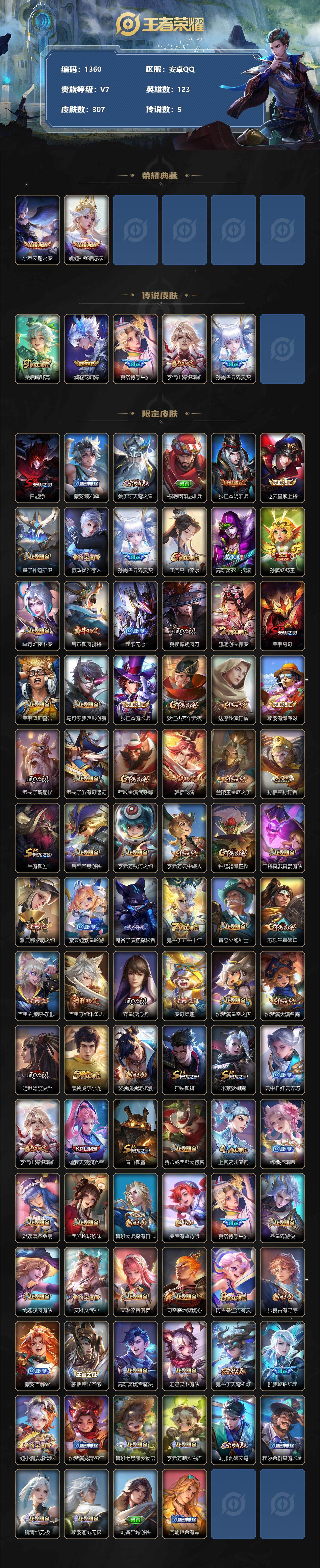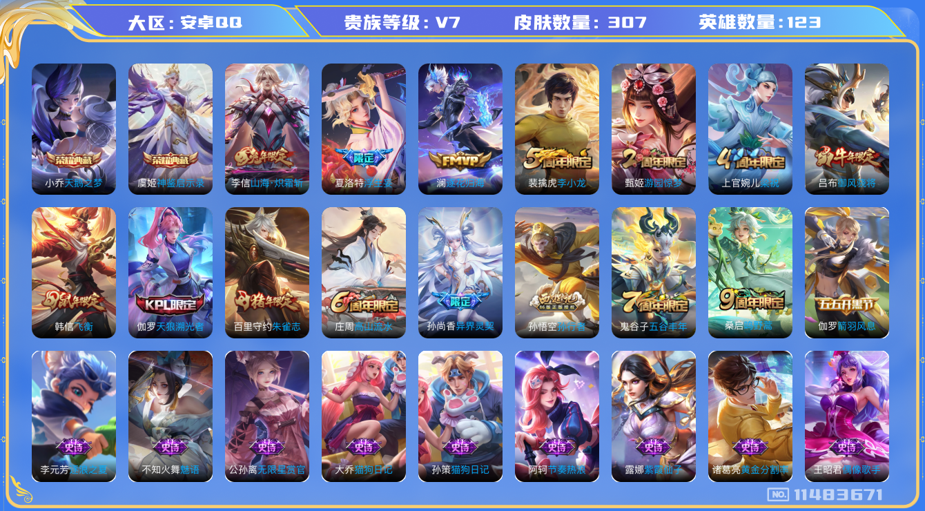 [11483671]【商品标题】:安卓Q-V7-尊贵铂金III段位-123英雄-307皮肤-2典藏-0珍品无双-0无双-0珍品传说-5传说-91史诗