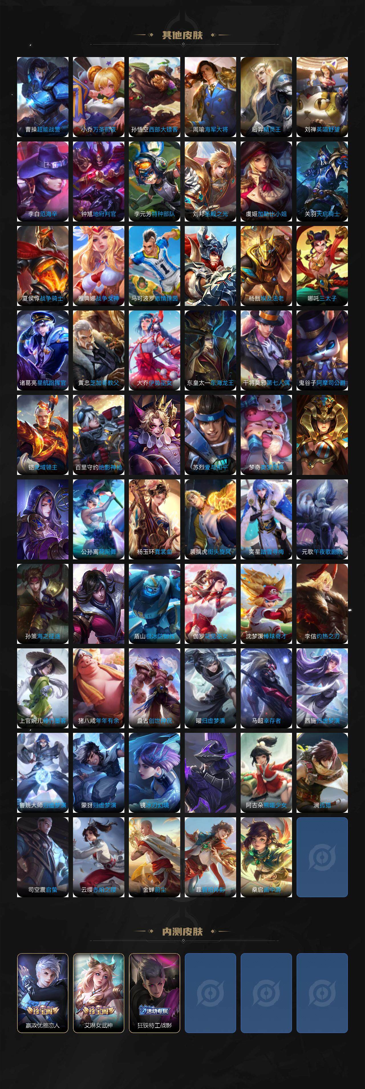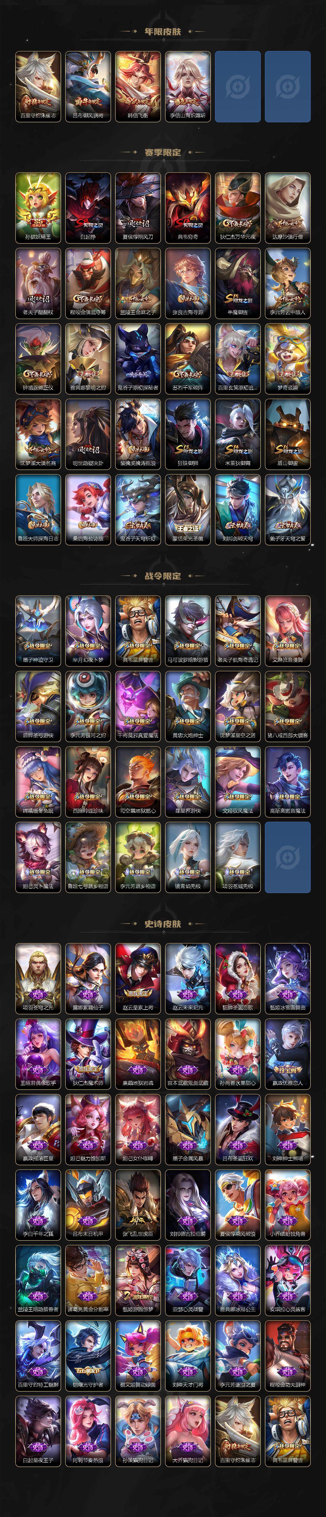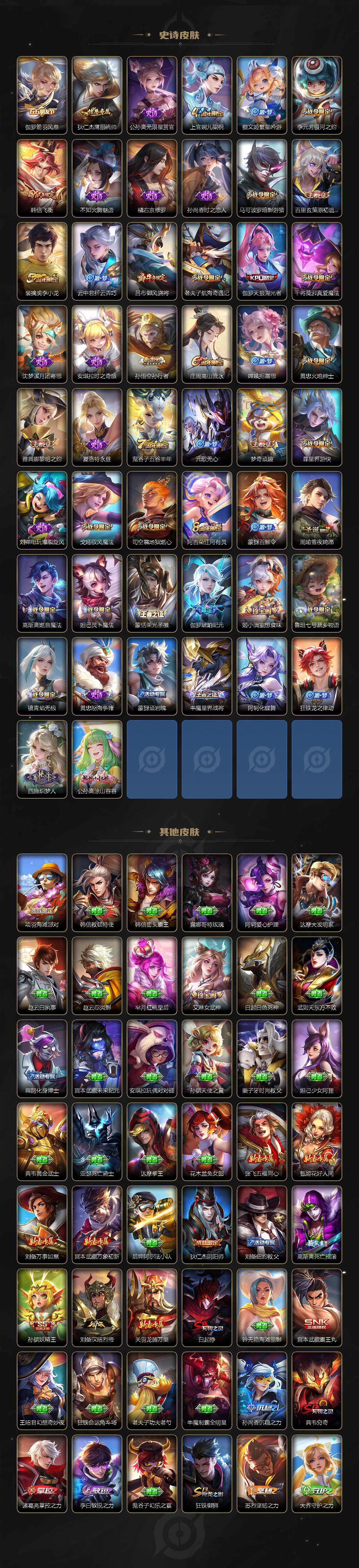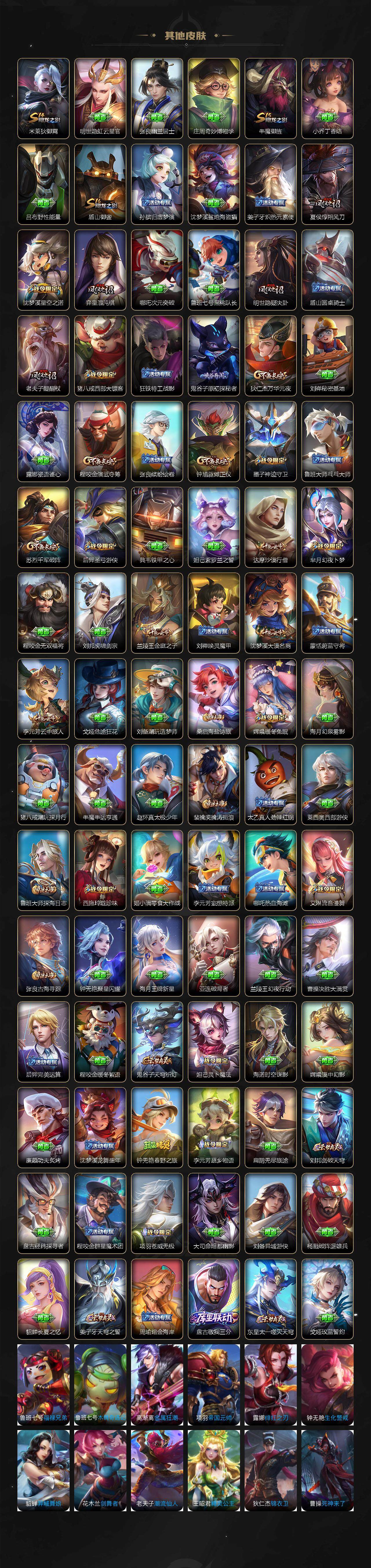 【限定皮肤】:白起狰,蒙犽顽岩魄,姜子牙天穹之誓,杨戬破阵退雄兵,狄仁杰阴阳师,赵云皇家上将,墨子神迹守卫,嬴政优雅恋人,孙尚香异界灵契,庄周高山流水,高渐离死亡摇滚,孙膑妖精王,芈月幻夜卜梦,吕布御风骁将,元歌无心,夏侯惇朔风刀,甄姬游园惊梦,典韦穷奇,典韦蓝屏警告,马可波罗暗影游猎,狄仁杰魔术师,狄仁杰万华元夜,达摩沙漠行僧,项羽海滩派对,老夫子醍醐杖,老夫子航海奇遇记,程咬金演武夺筹,韩信飞衡,兰陵王金庭之子,孙悟空孙行者,牛魔御旌,后羿圣弓游侠,李元芳银河之约,李元芳云中旅人,钟馗驱傩正仪,干将莫邪真爱魔法,雅典娜黎明之约,蔡文姬繁星吟游,鬼谷子原初探秘者,鬼谷子五谷丰年,黄忠火炮绅士,苏烈千军破阵,百里玄策原初追逐者,百里守约朱雀志,弈星混沌棋,梦奇顽趣,沈梦溪星空之诺,沈梦溪大漠名商,明世隐疑决卦,裴擒虎李小龙,裴擒虎擒涛扼浪,狂铁御狮,米莱狄御霄,云中君纤云弄巧,李信山海炽霜斩,伽罗天狼溯光者,盾山御銮,猪八戒西部大镖客,上官婉儿梁祝,嫦娥拒霜思,嫦娥暖冬兔眠,西施玲珑珍味,鲁班大师探海日志,桑启海盐诗旅,夏洛特浮生妄,暃星界游侠,戈娅驭风魔法,艾琳女武神,艾琳流音漫舞,司空震地狱燃心,阿古朵江河有灵,张良古海寻踪,蒙犽百解令,蒙恬荣光圣徽,高渐离燃音魔法,妲己灵卜魔法,鬼谷子天穹祈灯,伽罗琥珀纪元,姬小满妄想食味,沈梦溪龙舞盛年,鲁班七号蔬乡物语,李元芳蔬乡物语,刘邦剑破天穹,程咬金群星魔术团,镜青焰无极,项羽苍威无极,刘备异域游侠,周瑜熔金海岸