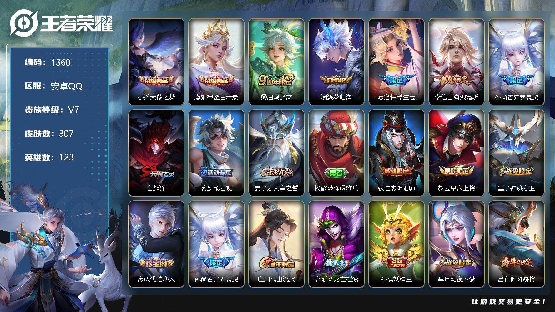 [11483671]【商品标题】:安卓Q-V7-尊贵铂金III段位-123英雄-307皮肤-2典藏-0珍品无双-0无双-0珍品传说-5传说-91史诗 【荣耀典藏】:小乔天鹅之梦,虞姬神鉴启示录 【传说皮肤】:桑启鸣野蒿,澜逐花归海,夏洛特浮生妄,李信山海炽霜斩,孙尚香异界灵契 【限定皮肤】:白起狰,蒙犽顽岩魄,姜子牙天穹之誓,杨戬破阵退雄兵,狄仁杰阴阳师,赵云皇家上将,墨子神迹守卫,嬴政优雅恋人,孙尚香异界灵契,庄周高山流水,高渐离死亡摇滚,孙膑妖精王,芈月幻夜卜梦,吕布御风骁将,元歌无心,夏侯惇朔风刀,甄姬游园惊梦,典韦穷奇,典韦蓝屏警告,马可波罗暗影游猎,狄仁杰魔术师,狄仁杰万华元夜,达摩沙漠行僧,项羽海滩派对,老夫子醍醐杖,老夫子航海奇遇记,程咬金演武夺筹,韩信飞衡,兰陵王金庭之子,孙悟空孙行者,牛魔御旌,后羿圣弓游侠,李元芳银河之约,李元芳云中旅人,钟馗驱傩正仪,干将莫邪真爱魔法,雅典娜黎明之约,蔡文姬繁星吟游,鬼谷子原初探秘者,鬼谷子五谷丰年,黄忠火炮绅士,苏烈千军破阵,百里玄策原初追逐者,百里守约朱雀志,弈星混沌棋,梦奇顽趣,沈梦溪星空之诺,沈梦溪大漠名商,明世隐疑决卦,裴擒虎李小龙,裴擒虎擒涛扼浪,狂铁御狮,米莱狄御霄,云中君纤云弄巧,李信山海炽霜斩,伽罗天狼溯光者,盾山御銮,猪八戒西部大镖客,上官婉儿梁祝,嫦娥拒霜思,嫦娥暖冬兔眠,西施玲珑珍味,鲁班大师探海日志,桑启海盐诗旅,夏洛特浮生妄,暃星界游侠,戈娅驭风魔法,艾琳女武神,艾琳流音漫舞,司空震地狱燃心,阿古朵江河有灵,张良古海寻踪,蒙犽百解令,蒙恬荣光圣徽,高渐离燃音魔法,妲己灵卜魔法,鬼谷子天穹祈灯,伽罗琥珀纪元,姬小满妄想食味,沈梦溪龙舞盛年,鲁班七号蔬乡物语,李元芳蔬乡物语,刘邦剑破天穹,程咬金群星魔术团,镜青焰无极,项羽苍威无极,刘备异域游侠,周瑜熔金海岸 【年限皮肤】:百里守约朱雀志,吕布御风骁将,韩信飞衡,李信山海炽霜斩 【赛季限定】:孙膑妖精王,白起狰,夏侯惇朔风刀,典韦穷奇,狄仁杰万华元夜,达摩沙漠行僧,老夫子醍醐杖,程咬金演武夺筹,兰陵王金庭之子,张良古海寻踪,牛魔御旌,李元芳云中旅人,钟馗驱傩正仪,雅典娜黎明之约,鬼谷子原初探秘者,苏烈千军破阵,百里玄策原初追逐者,弈星混沌棋,梦奇顽趣,沈梦溪大漠名商,明世隐疑决卦,裴擒虎擒涛扼浪,狂铁御狮,米莱狄御霄,盾山御銮,鲁班大师探海日志,桑启海盐诗旅