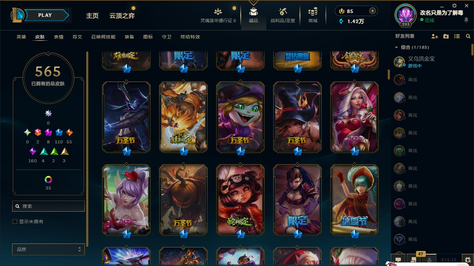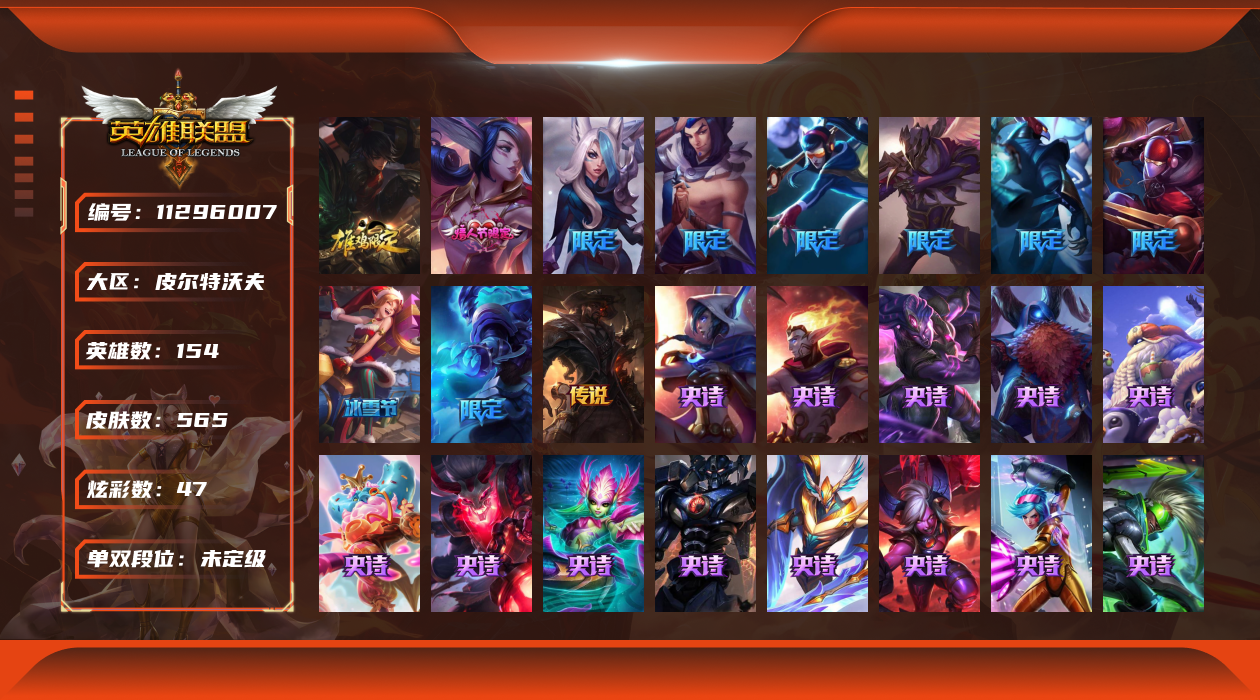 [11296007]可二次 可修改实名 2终极 7神话 2臻彩 111限定 55传说 160史诗 565皮肤 47炫彩 154英雄 皮肤:雷霆领主 奥恩,SSG 霞,甜心之羽 霞,暮星之羽 霞,SSG 洛,晨星之翎 洛,巴德·吟游诗人,冰雪游神 巴德,永恒之森 巴德,SKT T1 卡莉丝塔,腥红之月 卡莉丝塔,糖果之王 艾翁,泳池派对 雷克塞,虚空使者 俄洛伊,腥红之月 锤石,冠军典狱长 锤石,深渊恐惧 锤石,司马懿 仲达,SKT T1 阿兹尔,源代码 娜美,海皇姬 娜美,鲛妮座人 娜美,河水之灵 娜美,胜利之剑 亚托克斯,腥红之月 亚托克斯,狂鲨 亚托克斯,霸天剑魔 亚托克斯,仲裁圣骑 亚托克斯,源计划:裁决 蔚,虎痴之拳 蔚,炼狱魔女 蔚,铁拳执事 蔚,女警官 蔚,霓虹杀拳 蔚,源计划:自由 艾克,时之砂 艾克,爵士 克烈,源计划:阴 劫,SKT T1 劫,西部魔影 卢锡安,源计划:雷 卢锡安,夺命前锋 卢锡安,职业杀手 卢锡安,海牛大大 塔姆,五星大厨 塔姆,圣诞捣蛋鬼 金克丝,丧尸杀手 金克丝,神龙烈焰 金克丝,黑帮狂花 金克丝,银河魔装机神 千珏,SKT T1 烬,腥红之月 烬,西部牛仔 烬,黑帮管家 布隆,布隆·狮心,猛虎 布隆,屠龙勇士 布隆