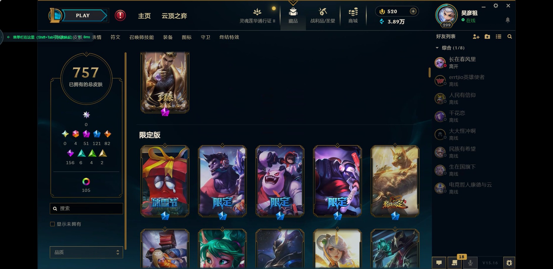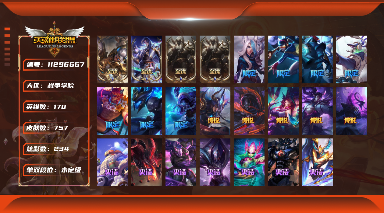 [11296667]可二次 可修改实名 4终极 50神话 17臻彩 121限定 82传说 156史诗 757皮肤 234炫彩 170英雄 皮肤:女帝 格温,太空律动 “百万调音” 格温,花仙子 莉莉娅,黑夜使者 莉莉娅,心之钢 瑟提,泳池派对 瑟提,至臻 神龙尊者 炎龙瑟提,神龙尊者 炎龙瑟提,至臻 心之钢 永恩,黎明使者 永恩,灵魂莲华 永恩,黎明使者 薇古丝,源计划:毁灭 派克,腥红之月 派克,怨之砂 派克,弗雷尔卓德 塞拉斯,永恒之森 奥恩,星之守护者 霞,SSG 霞,晨星之翎 洛,宇航员 巴德,巴德·吟游诗人,冰雪游神 巴德,SKT T1 卡莉丝塔,冠军之矛 卡莉丝塔,腥红之月 卡莉丝塔,黯晶巨兽 雷克塞,泳池派对 雷克塞,上古战魂 雷克塞,净雪之月 俄洛伊,抵抗军炎魔 俄洛伊,虚空使者 俄洛伊,灵魂莲华 锤石,未来战士 锤石,暗星 锤石,SSW 锤石,冠军典狱长 锤石,深渊恐惧 锤石,灵能特工 莎弥拉,魅惑女巫 悠米,SKT T1 阿兹尔,星际之门 阿兹尔,源代码 娜美,鲛妮座人 娜美,河水之灵 娜美,至臻 腥红之月 亚托克斯 (2022),胜利之剑 亚托克斯,至臻 腥红之月 亚托克斯,狂鲨 亚托克斯,霸天剑魔 亚托克斯,仲裁圣骑 亚托克斯