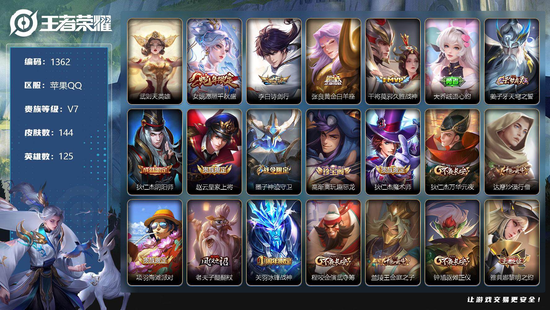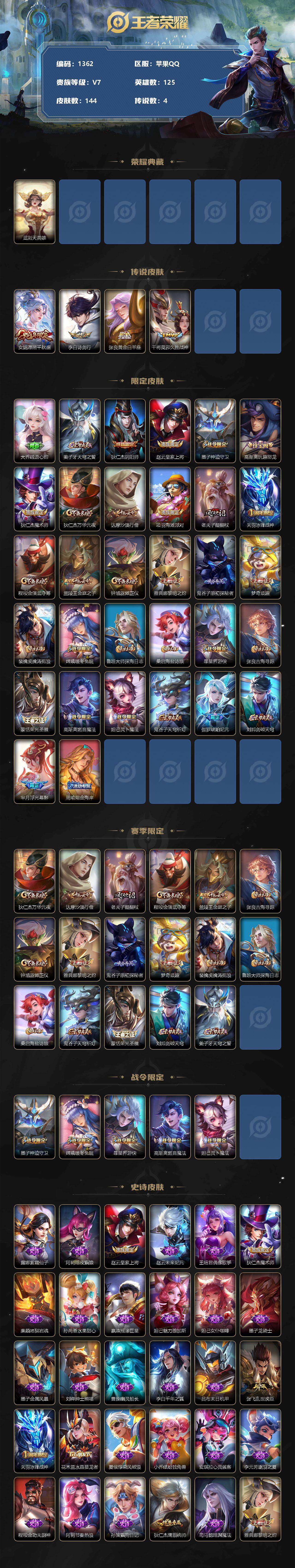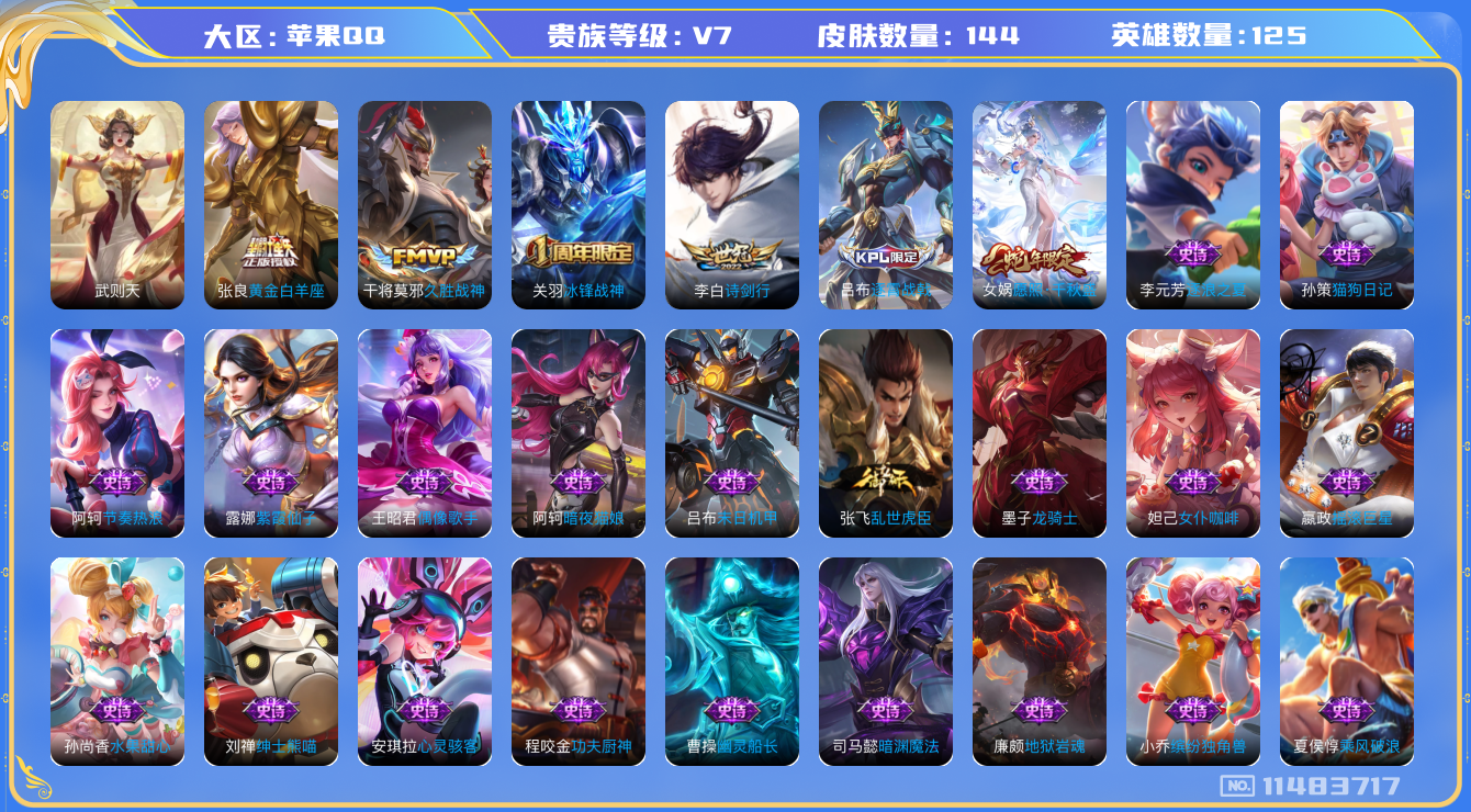 [11483717]【商品标题】:苹果Q-V7-永恒钻石III段位-125英雄-144皮肤-0典藏-0珍品无双-0无双-0珍品传说-4传说-42史诗