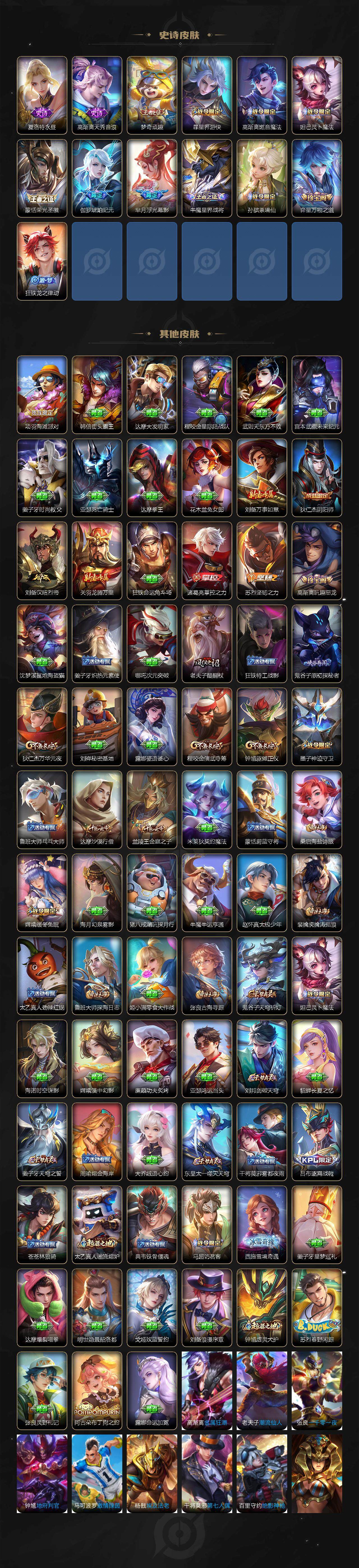 【史诗皮肤】:露娜紫霞仙子,阿轲暗夜猫娘,赵云皇家上将,赵云未来纪元,王昭君偶像歌手,狄仁杰魔术师,廉颇地狱岩魂,孙尚香水果甜心,嬴政摇滚巨星,妲己魅力维加斯,妲己女仆咖啡,墨子龙骑士,墨子金属风暴,刘禅绅士熊喵,曹操幽灵船长,李白千年之狐,吕布末日机甲,张飞乱世虎臣,关羽冰锋战神,花木兰水晶猎龙者,夏侯惇乘风破浪,小乔缤纷独角兽,安琪拉心灵骇客,李元芳逐浪之夏,程咬金功夫厨神,阿轲节奏热浪,孙策猫狗日记,狄仁杰鹰眼统帅,司马懿暗渊魔法,雅典娜黎明之约,夏洛特永昼,高渐离天秀音浪,梦奇顽趣,暃星界游侠,妲己灵卜魔法,高渐离燃音魔法,蒙恬荣光圣徽,伽罗琥珀纪元,芈月浮光幕影,牛魔星界战将,孙膑茶境仙,弈星万物之道,狂铁龙之律动