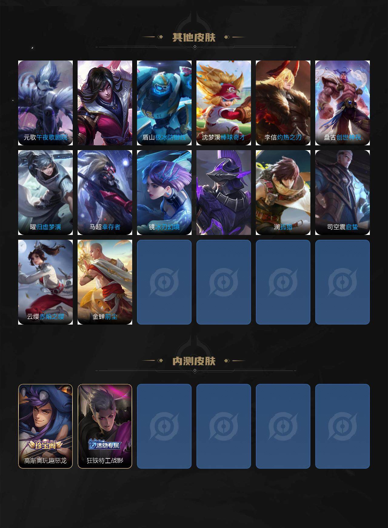 【赛季限定】:狄仁杰万华元夜,达摩沙漠行僧,老夫子醍醐杖,程咬金演武夺筹,兰陵王金庭之子,张良古海寻踪,钟馗驱傩正仪,雅典娜黎明之约,鬼谷子原初探秘者,梦奇顽趣,裴擒虎擒涛扼浪,鲁班大师探海日志,桑启海盐诗旅,鬼谷子天穹祈灯,蒙恬荣光圣徽,刘邦剑破天穹,姜子牙天穹之誓