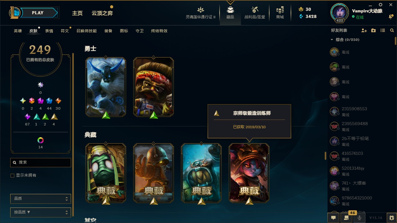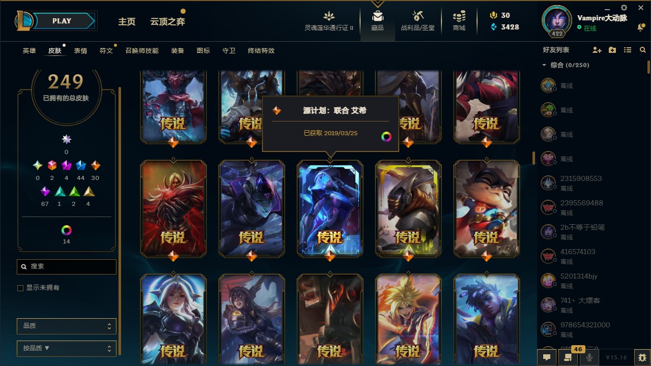 [11445885]可二次 可修改实名 2终极 4神话 44限定 30传说 67史诗 249皮肤 18炫彩 159英雄 皮肤:灵魂莲华 莉莉娅,神龙尊者 炎龙瑟提,王国机神苍狼 瑟提,甜心之羽 霞,永恒之森 巴德,腥红之月 卡莉丝塔,深渊恐惧 锤石,鲛妮座人 娜美,胜利之剑 亚托克斯,仲裁圣骑 亚托克斯,双城之战 蔚,铁拳执事 蔚,霓虹杀拳 蔚,真实伤害 艾克,冠军之隐 劫,冲击之刃 劫,胜利枪神 卢锡安,西部魔影 卢锡安,源计划:雷 卢锡安,五杀摇滚之噪音 佛耶戈,双城之战 金克丝,圣诞捣蛋鬼 金克丝,银河魔装机神 千珏,黯焰双魂 千珏,这货不是维克兹,腥红之月 亚索,源计划:风 亚索,西部牛仔 亚索,银河魔装机神 纳尔,泳池派对 佐伊,摄魂猎手 凯隐,冰雪女神 辛德拉,勇敢的心 奎因,血羽凤凰 奎因,黑潮 黛安娜,双城之战 杰斯,战斗学院 杰斯,神王 德莱厄斯,热血班长 德莱厄斯,灌篮高手 德莱厄斯,勇敢的心 德莱厄斯,生化骑士 德莱厄斯,霸天异形 卡兹克