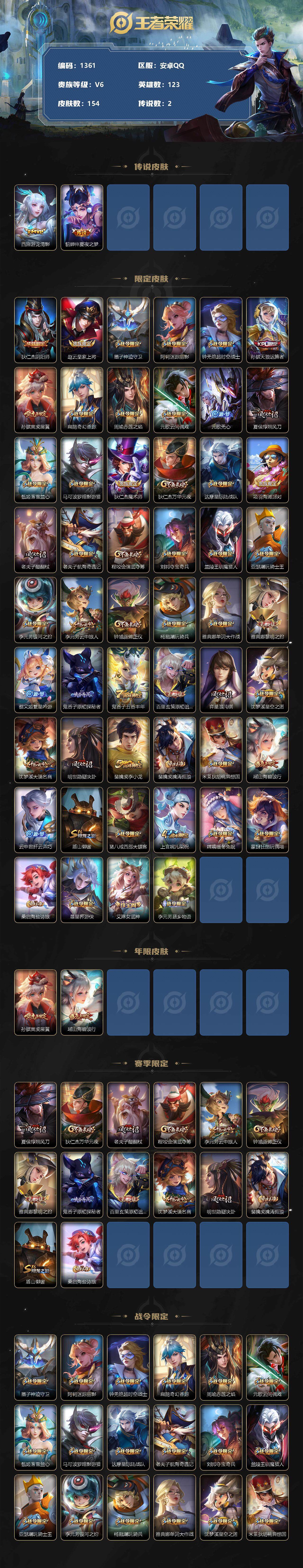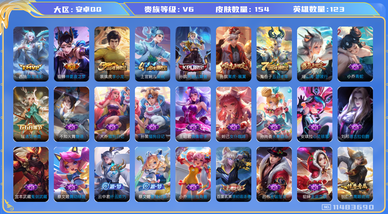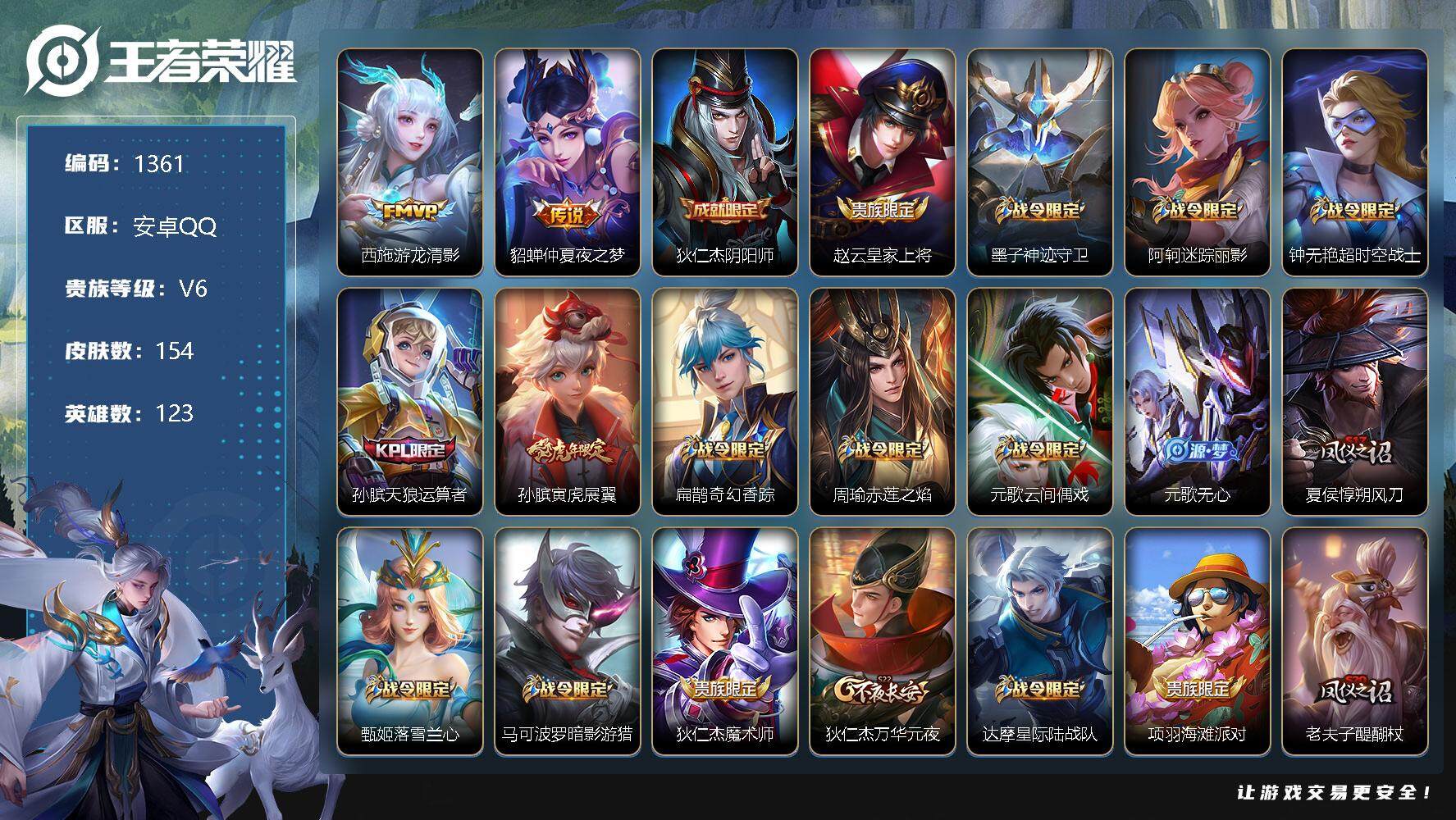 [11483690]【商品标题】:安卓Q-V6-至尊星耀I段位-123英雄-154皮肤-0典藏-0珍品无双-0无双-0珍品传说-2传说-48史诗