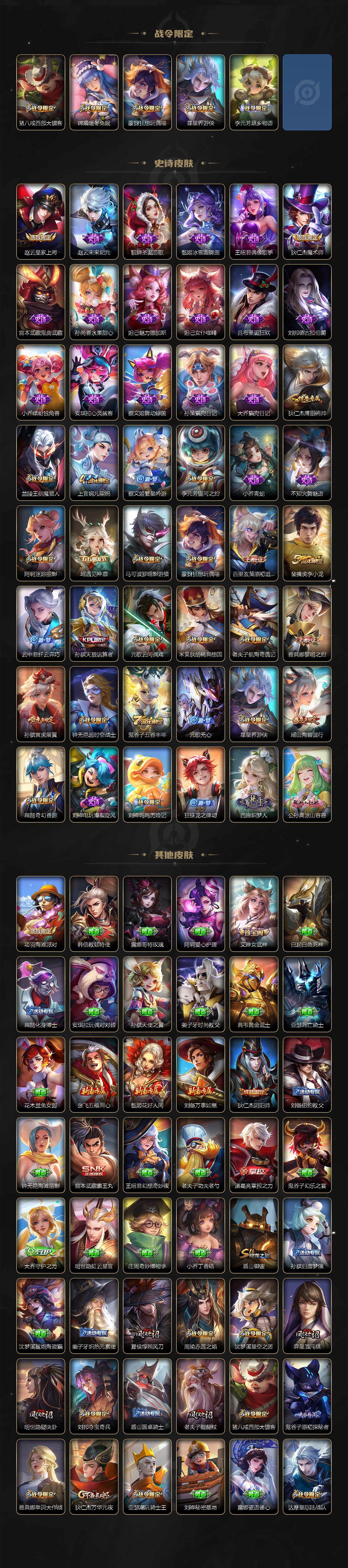 【战令限定】:墨子神迹守卫,阿轲迷踪丽影,钟无艳超时空战士,扁鹊奇幻香踪,周瑜赤莲之焰,元歌云间偶戏,甄姬落雪兰心,马可波罗暗影游猎,达摩星际陆战队,老夫子航海奇遇记,刘邦夺宝奇兵,兰陵王驯魔猎人,亚瑟潮玩骑士王,李元芳银河之约,杨戬潮玩骑兵,雅典娜单词大作战,沈梦溪星空之诺,米莱狄胡桃异想国,猪八戒西部大镖客,嫦娥暖冬兔眠,蒙犽狂想玩偶喵,暃星界游侠,李元芳蔬乡物语