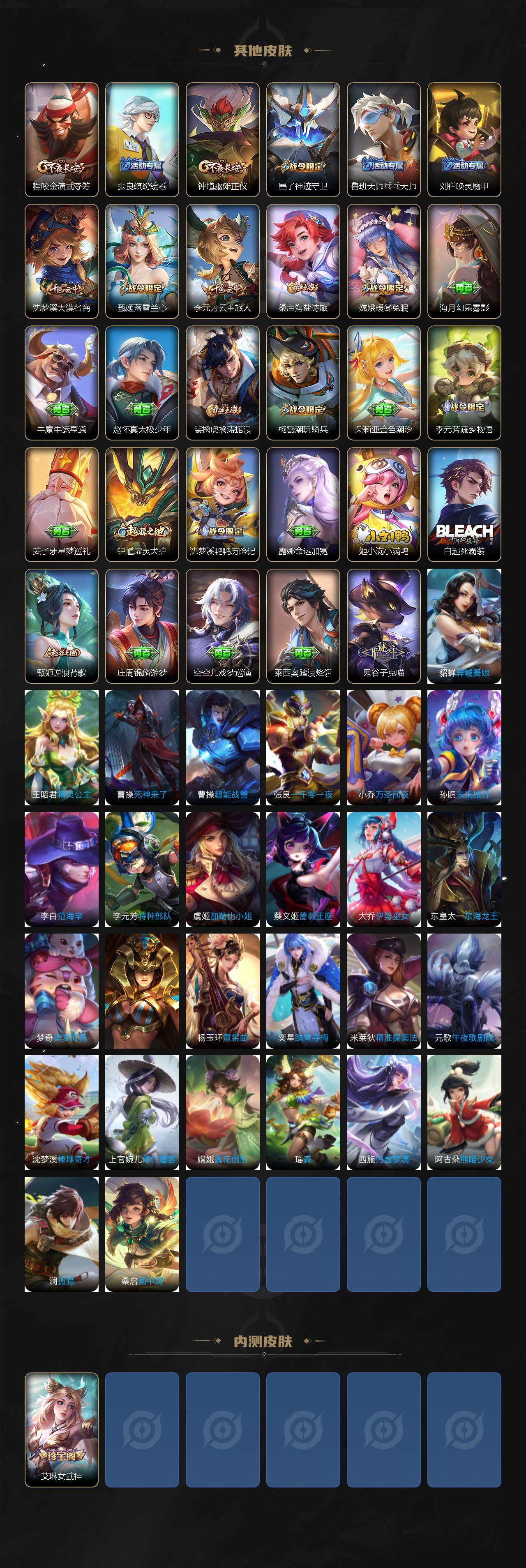 【限定皮肤】:狄仁杰阴阳师,赵云皇家上将,墨子神迹守卫,阿轲迷踪丽影,钟无艳超时空战士,孙膑天狼运算者,孙膑寅虎展翼,扁鹊奇幻香踪,周瑜赤莲之焰,元歌云间偶戏,元歌无心,夏侯惇朔风刀,甄姬落雪兰心,马可波罗暗影游猎,狄仁杰魔术师,狄仁杰万华元夜,达摩星际陆战队,项羽海滩派对,老夫子醍醐杖,老夫子航海奇遇记,程咬金演武夺筹,刘邦夺宝奇兵,兰陵王驯魔猎人,亚瑟潮玩骑士王,李元芳银河之约,李元芳云中旅人,钟馗驱傩正仪,杨戬潮玩骑兵,雅典娜单词大作战,雅典娜黎明之约,蔡文姬繁星吟游,鬼谷子原初探秘者,鬼谷子五谷丰年,百里玄策原初追逐者,弈星混沌棋,沈梦溪星空之诺,沈梦溪大漠名商,明世隐疑决卦,裴擒虎李小龙,裴擒虎擒涛扼浪,米莱狄胡桃异想国,瑶山海碧波行,云中君纤云弄巧,盾山御銮,猪八戒西部大镖客,上官婉儿梁祝,嫦娥暖冬兔眠,蒙犽狂想玩偶喵,桑启海盐诗旅,暃星界游侠,艾琳女武神,李元芳蔬乡物语