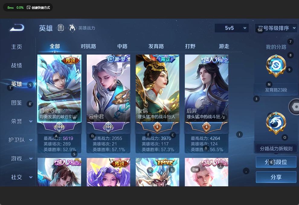 - [11471666]V5 8传说 123英雄 144皮肤 可修改实名 优质装备:云鹰飞将(小将军),时之恋人-刘备(电焊工),山海·炽霜斩(李信年限),遇见神鼓 传说皮:乘龙·淬吴钩(孙策年限) 珍宝阁皮:妄想食味 限定皮:鸣野蒿,诗剑行,齐天大圣,五谷丰年,山海·玄木吟(马可年限) 史诗皮:化蝶舞,紫霞仙子,特工魅影,千年之狐,电玩·爆裂旋风,江河有灵,百解令(蒙犽),高渐离燃音魔法,无限星赏官,时之恋人-孙尚香,乱世虎臣,节奏热浪,水果甜心,绅士熊喵,心灵骇客,功夫厨神,暗隐猎兽者,幽灵船长,鬼剑武藏,舞动绿茵,地狱岩魂,纤云弄巧,拒霜思,逐浪之夏,龙鼓争鸣,水晶猎龙者,曙光守护者,箭羽风息,金属风暴,鹰眼统帅,魅力维加斯,无心