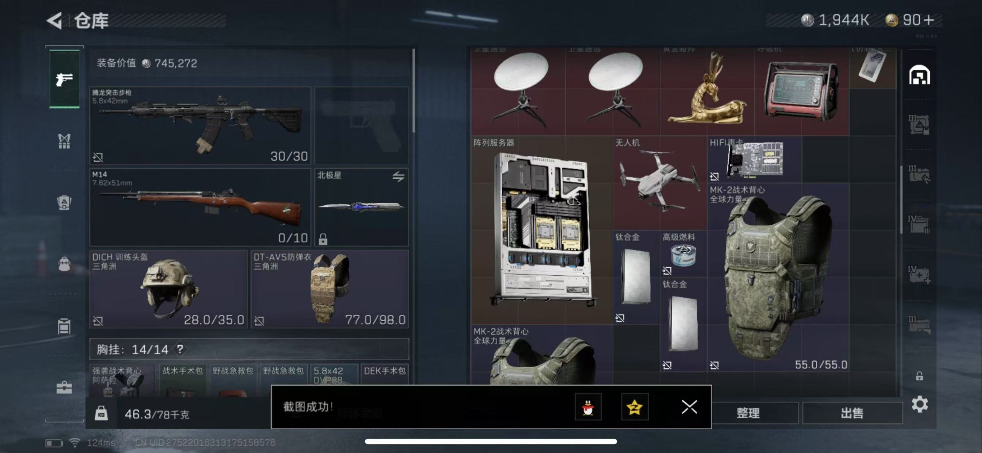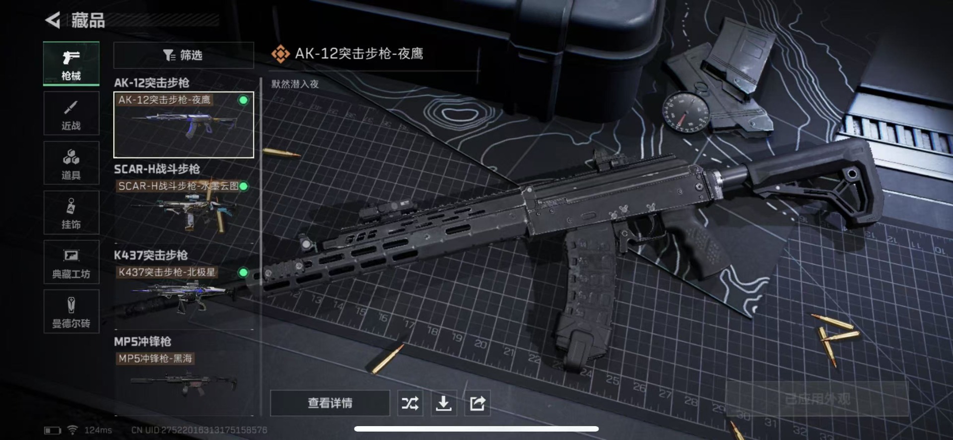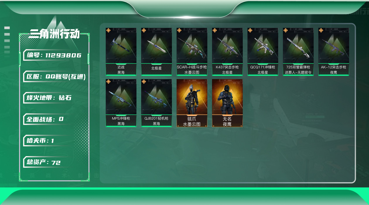 [11293806]总资产:72.1M 2干员外观 2近战传说 9传说枪械 哈夫币:1.944K 可二次 可修改实名 优质装备:近战-黑海,近战-北极星 烽火地带段位:钻石 全面战场段位:无段位 传说武器皮肤:SCAR-H战斗步枪-水墨云图,K437突击步枪-北极星,QCQ171冲锋枪-北极星,725双管霰弹枪-送葬人-无题密令,AK-12突击步枪-夜鹰,MP5冲锋枪-黑海,QJB201轻机枪-黑海 干员外观:骇爪-水墨云图,无名-夜鹰