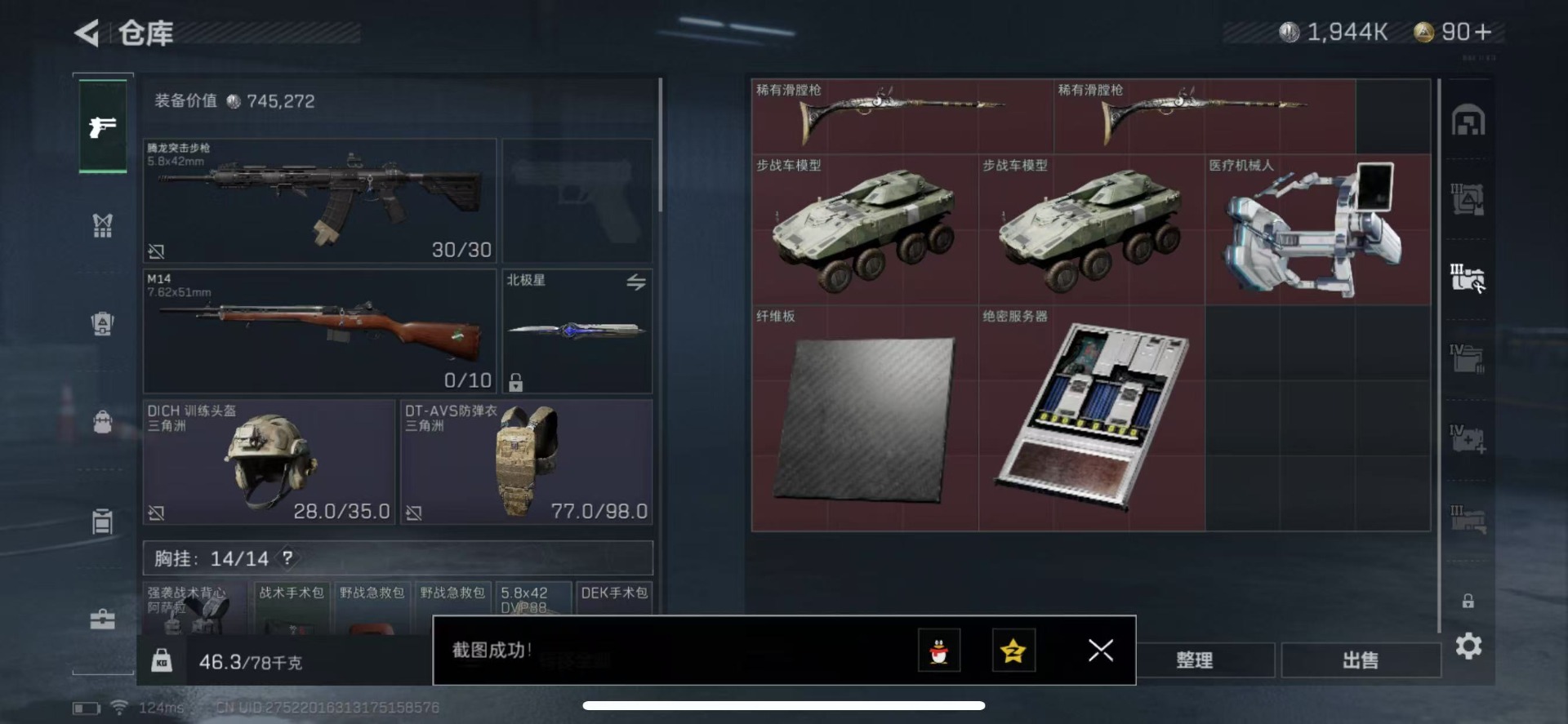 - [11515316]总资产:155.3M 9传说枪械 哈夫币:87.322K 进阶安全箱(9.17到期) 可二次 可修改实名 烽火地带段位:钻石 全面战场段位:无段位 传说武器皮肤:M4A1突击步枪-阿米娅,AWM狙击步枪-捞点薯条,腾龙突击步枪-捞点薯条,93R-捞点薯条,AK-12突击步枪-特斯拉线圈,SR-3M紧凑突击步枪-特斯拉线圈,UZI冲锋枪-特斯拉线圈,勇士冲锋枪-能天使-午夜邮差,Vector冲锋枪-能天使-午夜邮差 史诗武器皮肤:M16A4突击步枪-竞赛选手,勇士冲锋枪-深海恐惧,SV-98狙击步枪-林中猎手,SV-98狙击步枪-囚徒