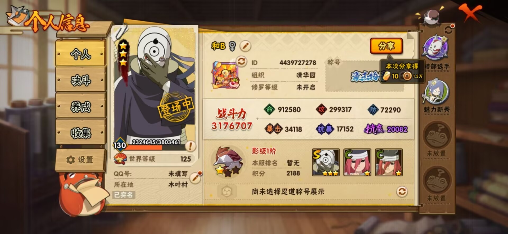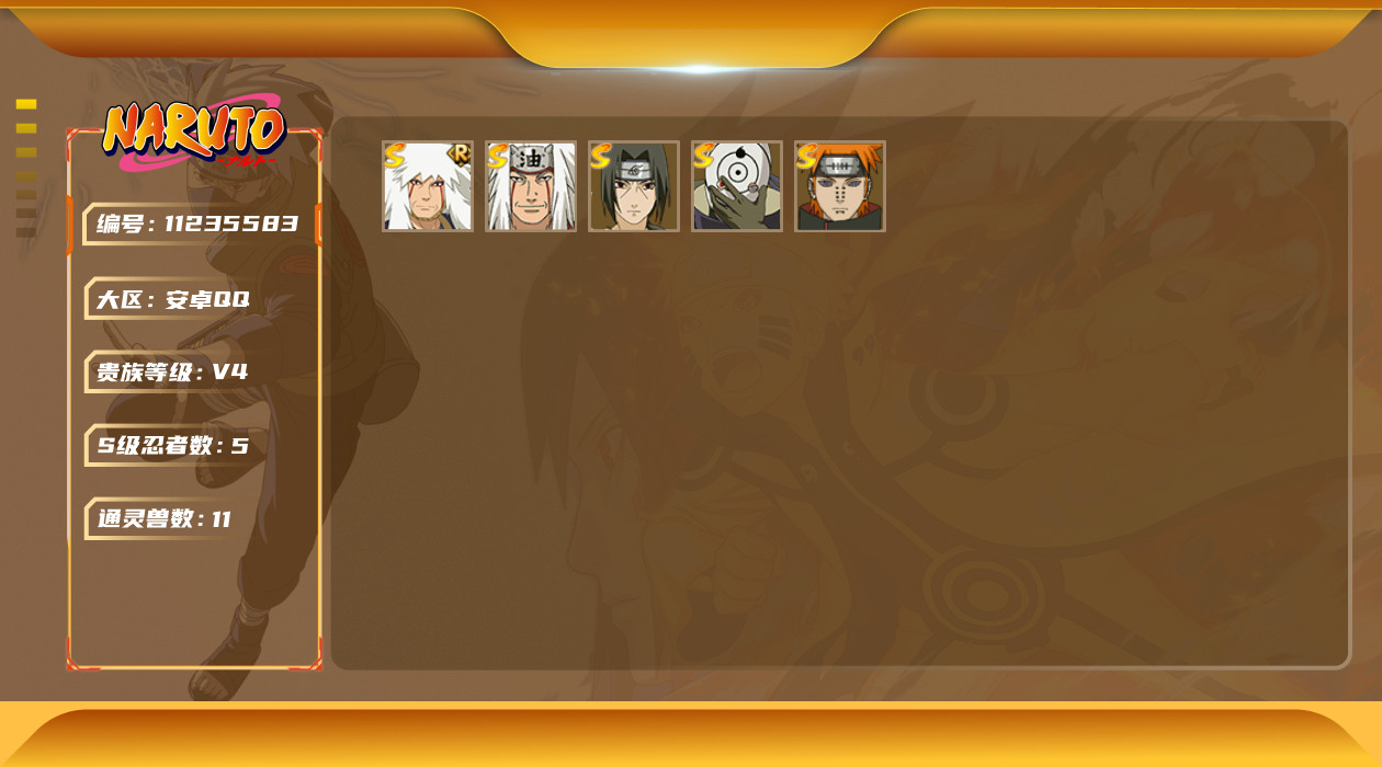 [11235583]V4 5S忍 13A忍 11通灵 317.6W战力 可二次 可修改实名 优质装备:“宇智波斑” 「白面具」 S级忍者:自来也 「舞之豪杰」,宇智波鼬 「须佐能乎」,佩恩「天道」,自来也
