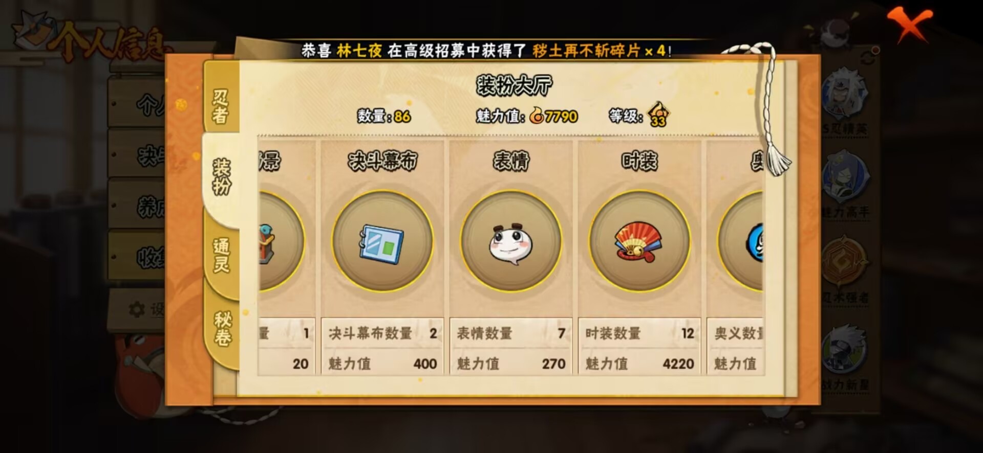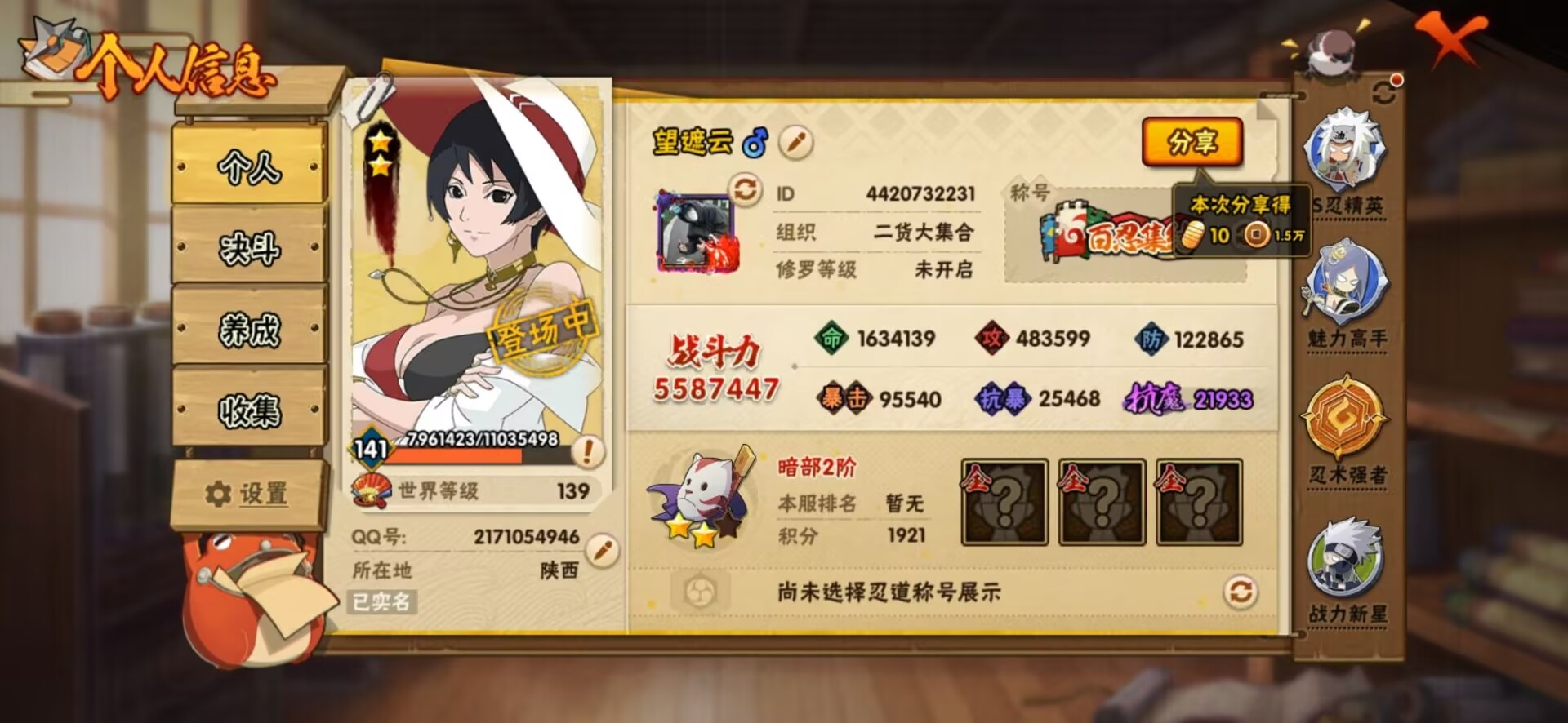[11290583]V12 15S忍 35A忍 16通灵 558.7W战力 可二次 可修改实名 优质装备:熊猫,千手柱间「秽土转生」,宇智波鼬「秽土转生」,药师兜「仙人模式」,宇智波斑「秽土转生」,“宇智波斑” 「白面具」,漩涡鸣人 「九喇嘛连结」,宇智波斑「秽土转生·解」,旗木卡卡西「须佐能乎」,大筒木舍人 「最终章」,漩涡鸣人 「暴怒·第六尾」 S级忍者:自来也 「舞之豪杰」,宇智波鼬 「须佐能乎」,佩恩「天道」,波风水门,大蛇丸