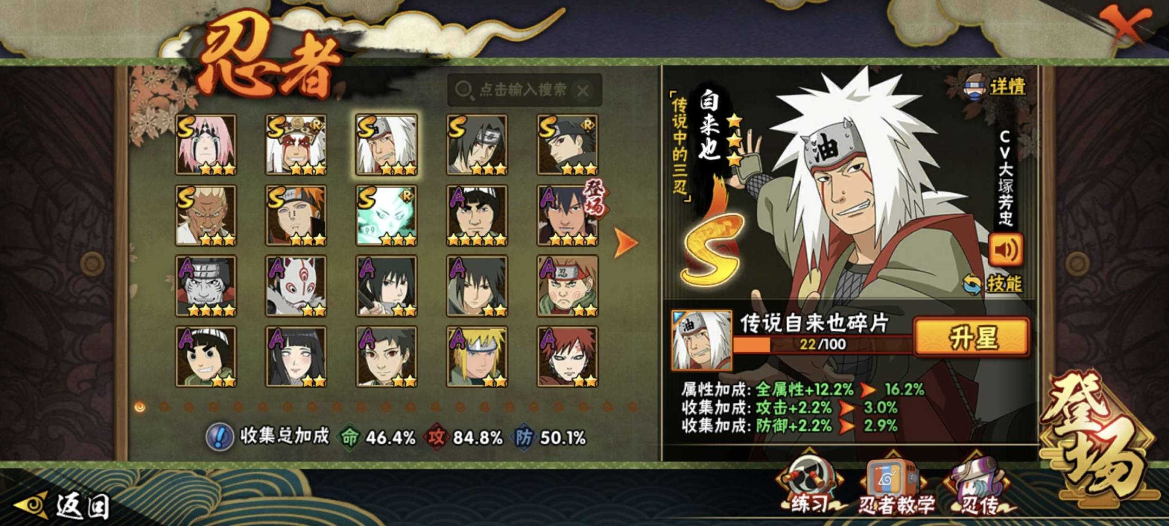 [11385946],贵族等级 V11 S忍数 8 A忍数 32 时装数 13 战力值(万) 7733403 S级忍者(6) 自来也 「舞之豪杰」,春野樱 「忍界大战」,艾「忍界大战」,宇智波止水「须佐能乎」,大筒木舍人 「最终章」,自来也 「传说中的三忍」 三星S(6) 自来也「舞之豪杰」,春野樱 「忍界大战」,艾「忍界大战」,宇智波止水「须佐能乎」,大筒木舍人 「最终章」,自来也 「传说中的三忍」 五星A(1) 迈特凯 二星A(21) 千手扉间「漂泊武士」,宇智波止水「新春限定」,宇智波佐助「须佐能乎」,小南「新春限定」,神秘面具男 「忍者之路」,波风水门 「青年」,长门「青年」,卑留呼「火之意志继承者」,纲手「侠隐江湖」,长十郎「六代目水影」,我爱罗 「新春限定」,小南「漂泊浪客」,漩涡博人「桃式显现」,日向雏田 「最终章」,旗木卡卡西 「幻之真容」,药师兜「侠隐江湖」,李洛克「忍界大战」,角都「秽土转生」,大蛇丸 「新春限定」,蝎「绯流琥」,宇智波泉奈 通灵兽(3) 熊猫,蛞蝓·侠隐江湖,守鹤 角色时装(12) 黑土·博人传-烈土霓裳,自来也·舞之豪杰-蜀面豪杰,猿飞阿斯玛-桀骜之刃,宇智波佐良娜