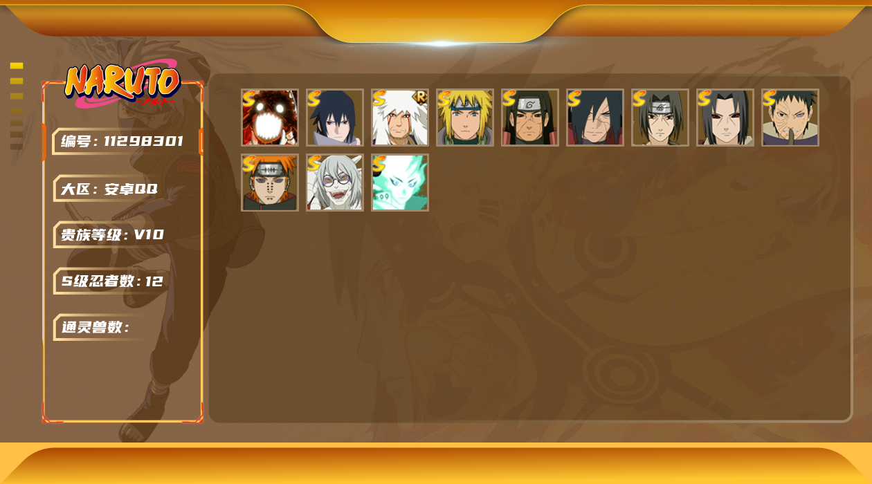 [11298301]V10 12S忍 21A忍 540W战力 可二次 可修改实名 优质装备:千手柱间「秽土转生」,宇智波鼬「秽土转生」,药师兜「仙人模式」,宇智波带土 「忍界大战」,宇智波佐助「永恒万花筒」,宇智波斑「秽土转生·解」,大筒木舍人 「最终章」,漩涡鸣人 「暴怒·第六尾」 S级忍者:自来也 「舞之豪杰」,宇智波鼬 「须佐能乎」,佩恩「天道」,波风水门