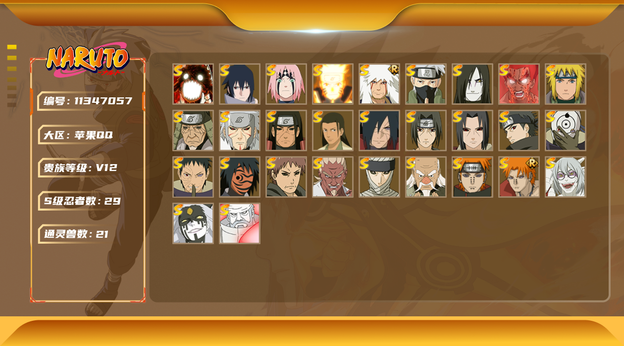 [11347057]V12 29S忍 45A忍 21通灵 1057.1W战力 可二次 可修改实名 优质装备:熊猫,千手柱间「秽土转生」,罗砂「四代目风影」,宇智波鼬「秽土转生」,佩恩·天道「超」,药师兜「仙人模式」,千手扉间「秽土转生」,无「二代目土影」,猿飞日斩「秽土转生」,迈特凯「死门」,宇智波带土 「忍界大战」,“宇智波斑” 「白面具」,漩涡鸣人 「九喇嘛连结」,大筒木金式「博人传」,春野樱 「忍界大战」,神秘面具男 「红夜之刃」,宇智波佐助「永恒万花筒」,千手柱间·木叶创立,宇智波斑「秽土转生·解」,大筒木桃式,艾「忍界大战」,宇智波止水「须佐能乎」,旗木卡卡西「须佐能乎」,漩涡鸣人 「暴怒·第六尾」 S级忍者:大野木 「忍界大战」,自来也 「舞之豪杰」,宇智波鼬 「须佐能乎」,佩恩「天道」,波风水门,大蛇丸