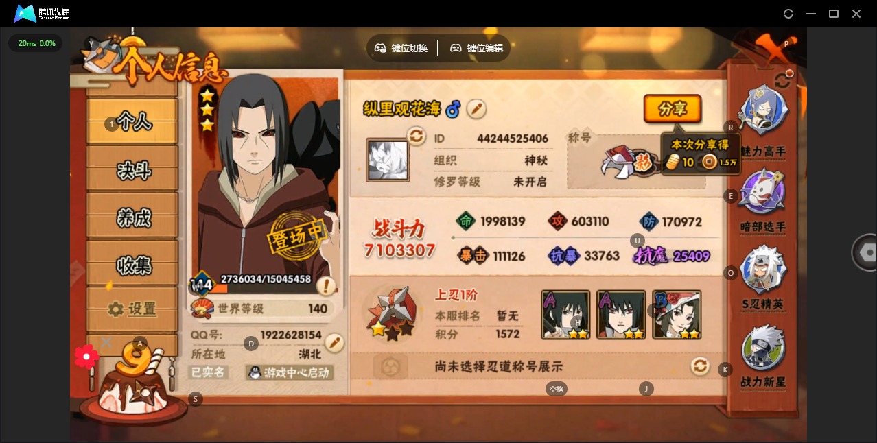 [11323318]V10 14S忍 32A忍 18通灵 710.3W战力 可二次 可修改实名 优质装备:熊猫,千手柱间「秽土转生」,宇智波鼬「秽土转生」,宇智波带土 「忍界大战」,“宇智波斑” 「白面具」,宇智波佐助「永恒万花筒」,宇智波斑「秽土转生·解」,宇智波止水「须佐能乎」,旗木卡卡西「须佐能乎」 S级忍者:自来也 「舞之豪杰」,宇智波鼬 「须佐能乎」,佩恩「天道」,波风水门,大蛇丸,自来也