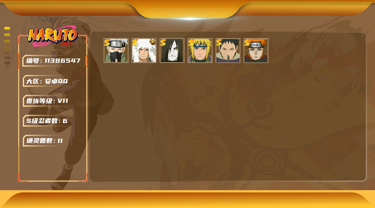 [11386547]V11 6S忍 15A忍 11通灵 301.2W战力 可二次 可修改实名 优质装备:宇智波带土 「忍界大战」,旗木卡卡西「须佐能乎」 S级忍者:自来也 「舞之豪杰」,佩恩「天道」,波风水门,大蛇丸
