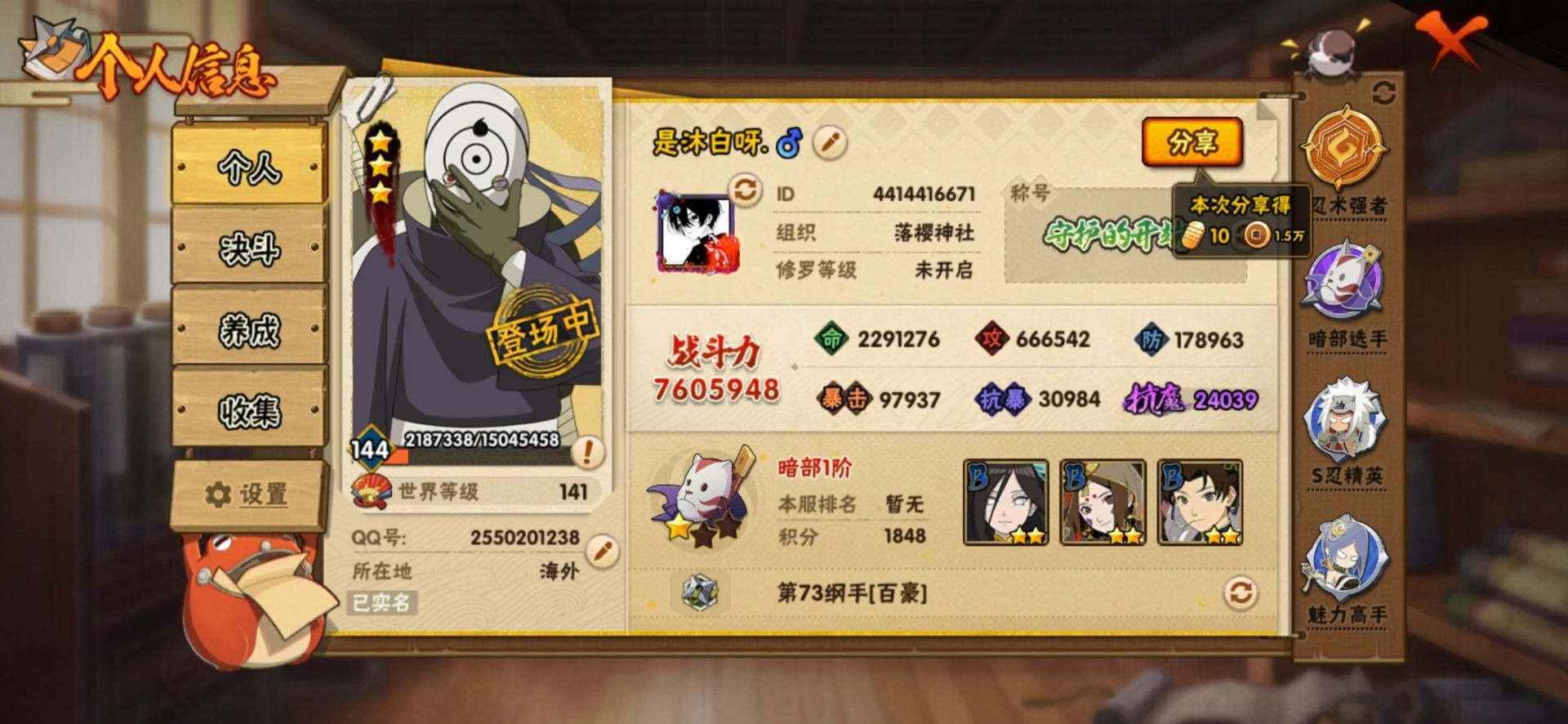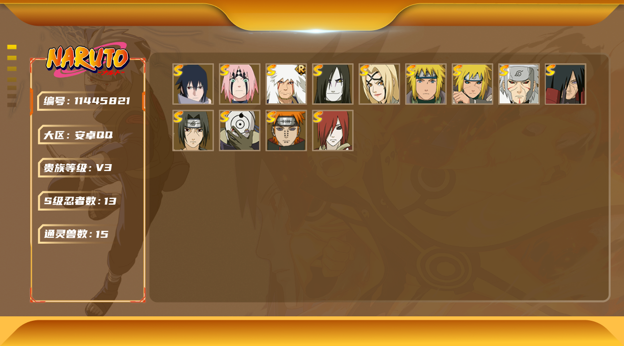 [11445821]V3 13S忍 27A忍 15通灵 760.5W战力 可二次 可修改实名 优质装备:宇智波斑「秽土转生」,千手扉间「秽土转生」,纲手「百豪」,波风水门「秽土转生」,长门「秽土转生」,“宇智波斑” 「白面具」,春野樱 「忍界大战」,宇智波佐助「永恒万花筒」 S级忍者:自来也 「舞之豪杰」,宇智波鼬 「须佐能乎」,佩恩「天道」,波风水门,大蛇丸
