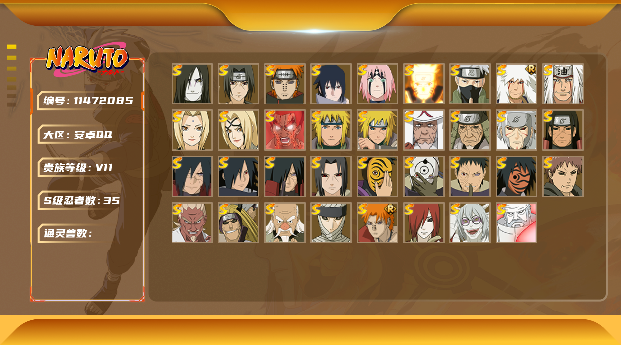 [11472085]V11 35S忍 53A忍 1542.3W战力 可二次 可修改实名 S级忍者:艾「忍界大战」,宇智波斑「秽土转生·解」,宇智波佐助「永恒万花筒」,神秘面具男 「红夜之刃」,春野樱 「忍界大战」,大筒木金式「博人传」,漩涡鸣人 「九喇嘛连结」,大野木 「忍界大战」,迈特凯「死门」,宇智波斑 「木叶创立」,宇智波带土 「忍界大战」,千手柱间「秽土转生」,罗砂「四代目风影」,自来也 「舞之豪杰」,旗木卡卡西「须佐能乎」,宇智波鼬「秽土转生」,佩恩·天道「超」,药师兜「仙人模式」,宇智波斑「秽土转生」,“宇智波斑” 「白面具」,千手扉间「秽土转生」,纲手「百豪」,波风水门「秽土转生」,无「二代目土影」,金角/银角「秽土转生」,猿飞日斩「秽土转生」,长门「秽土转生」,神秘面具男,宇智波鼬 「须佐能乎」,佩恩「天道」,猿飞日斩,波风水门,大蛇丸,自来也,纲手