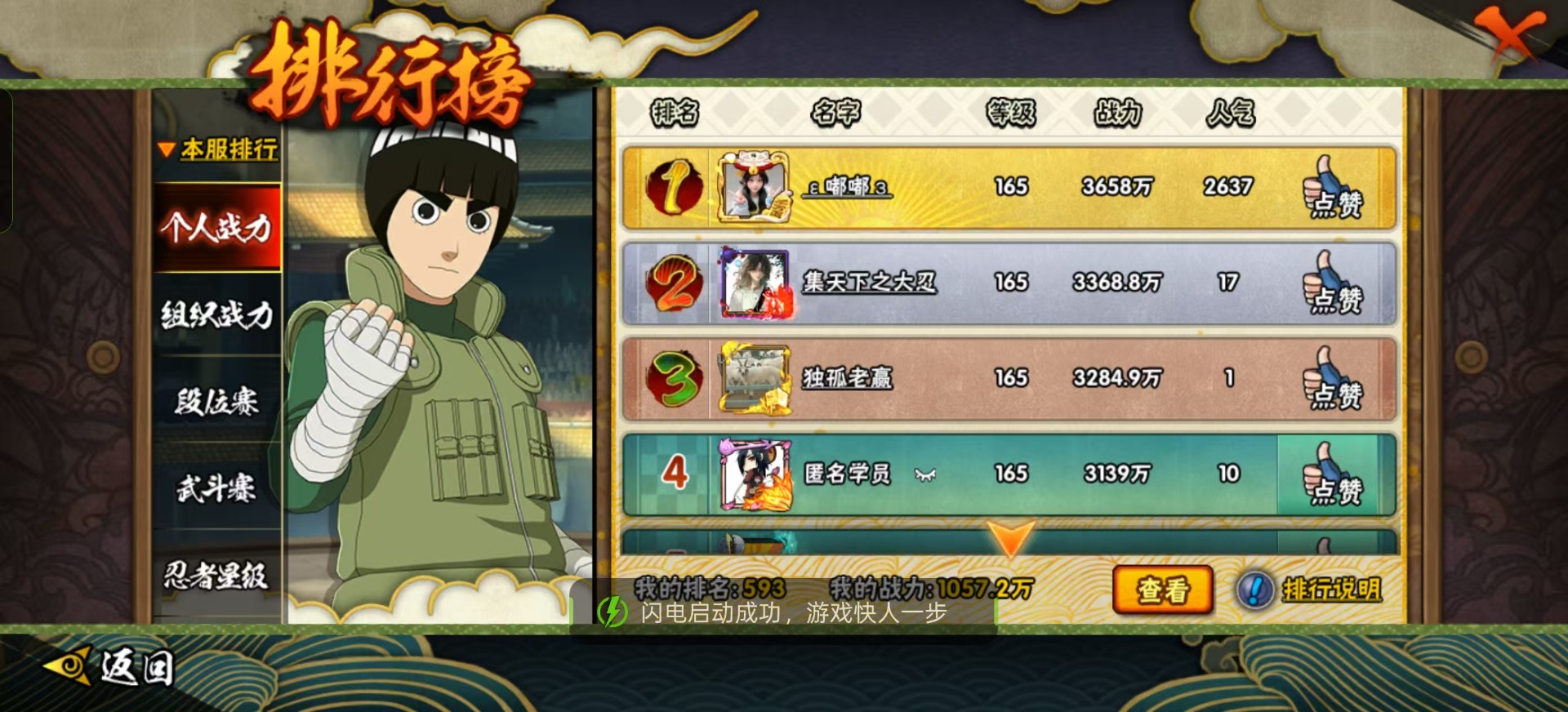 [11446203]V10 20S忍 42A忍 19通灵 1057.2W战力 可二次 优质装备:熊猫,宇智波鼬「秽土转生」,药师兜「仙人模式」,宇智波斑「秽土转生」,千手扉间「秽土转生」,纲手「百豪」,长门「秽土转生」,迈特凯「死门」,宇智波带土 「忍界大战」,“宇智波斑” 「白面具」,漩涡鸣人 「九喇嘛连结」,宇智波佐助「永恒万花筒」,宇智波斑「秽土转生·解」,旗木卡卡西「须佐能乎」,自来也 「传说中的三忍」 S级忍者:自来也 「舞之豪杰」,宇智波鼬 「须佐能乎」,佩恩「天道」,波风水门,大蛇丸,自来也