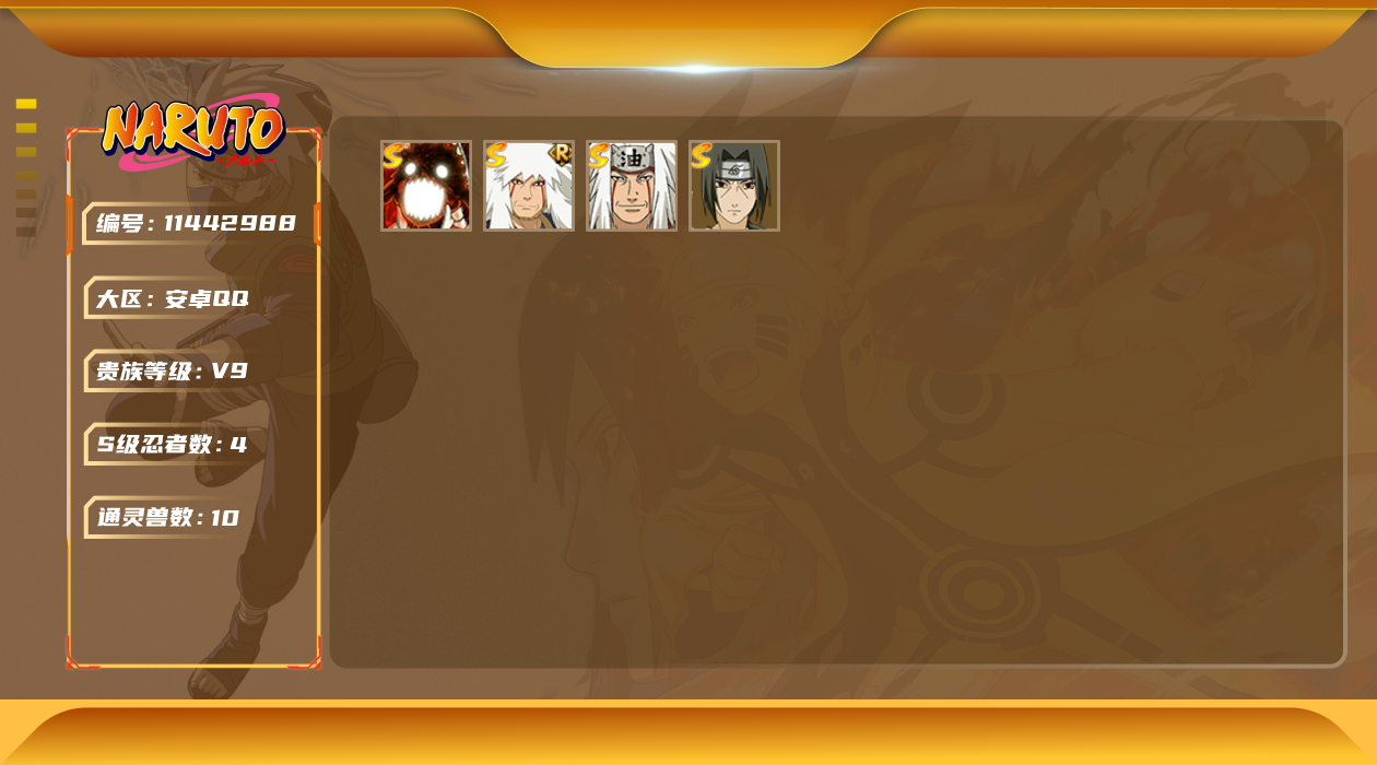 [11442988]V9 4S忍 14A忍 10通灵 305W战力 可二次 可修改实名 优质装备:漩涡鸣人 「暴怒·第六尾」 S级忍者:自来也 「舞之豪杰」,宇智波鼬 「须佐能乎」,自来也