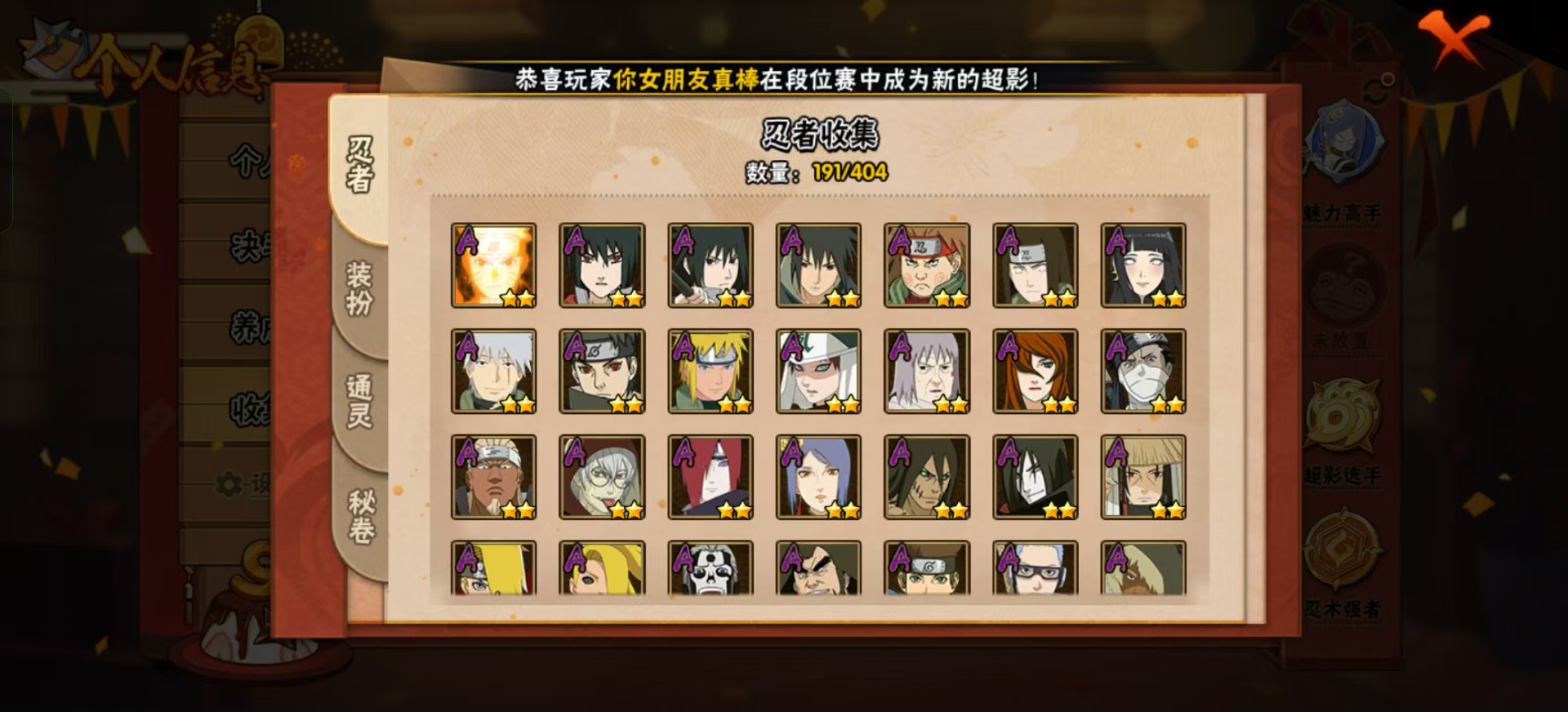 [11445928]V11 20S忍 39A忍 21通灵 1054.1W战力 可二次 优质装备:熊猫,药师兜「仙人模式」,宇智波斑「秽土转生」,千手扉间「秽土转生」,纲手「百豪」,波风水门「秽土转生」,猿飞日斩「秽土转生」,长门「秽土转生」,宇智波带土 「忍界大战」,“宇智波斑” 「白面具」,漩涡鸣人 「九喇嘛连结」,宇智波佐助「永恒万花筒」,宇智波斑「秽土转生·解」,宇智波止水「须佐能乎」,大筒木舍人 「最终章」,漩涡鸣人 「暴怒·第六尾」 S级忍者:自来也 「舞之豪杰」,宇智波鼬 「须佐能乎」,佩恩「天道」,波风水门,大蛇丸