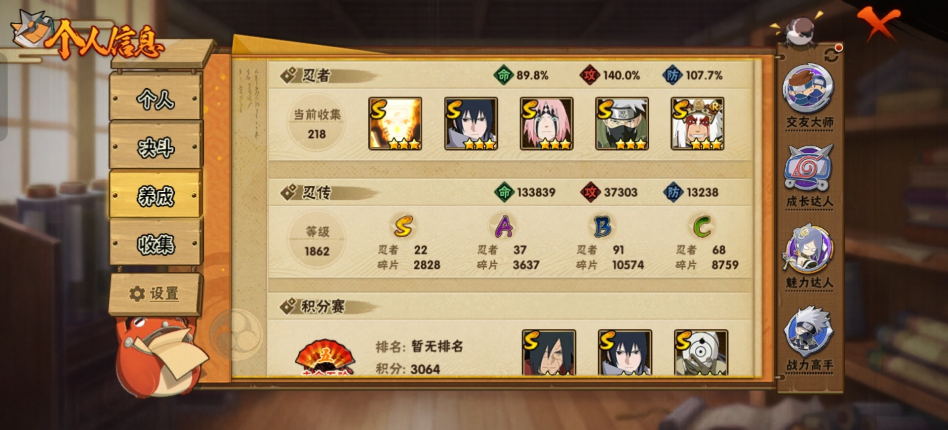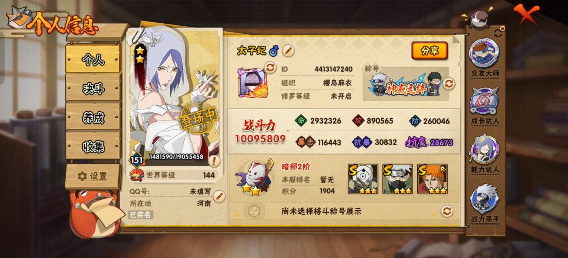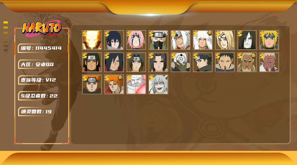 [11445414]V12 22S忍 34A忍 19通灵 1009.5W战力 可二次 可修改实名 优质装备:千手柱间「秽土转生」,宇智波鼬「秽土转生」,佩恩·天道「超」,药师兜「仙人模式」,艾「三代目雷影」,纲手「百豪」,宇智波带土 「忍界大战」,“宇智波斑” 「白面具」,漩涡鸣人 「九喇嘛连结」,大筒木金式「博人传」,春野樱 「忍界大战」,宇智波佐助「永恒万花筒」,宇智波斑「秽土转生·解」,艾「忍界大战」,宇智波止水「须佐能乎」,旗木卡卡西「须佐能乎」,自来也 「传说中的三忍」 S级忍者:自来也 「舞之豪杰」,宇智波鼬 「须佐能乎」,佩恩「天道」,波风水门,大蛇丸