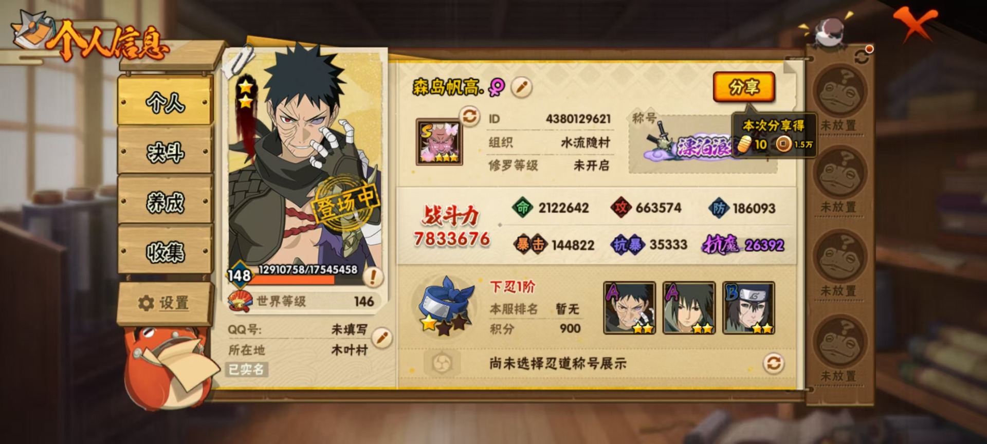 [11471284]V11 15S忍 31A忍 19通灵 783.3W战力 可二次 可修改实名 优质装备:熊猫,药师兜「仙人模式」,宇智波斑「秽土转生」,纲手「百豪」,迈特凯「死门」,漩涡鸣人 「九喇嘛连结」,宇智波佐助「永恒万花筒」,千手柱间·木叶创立,宇智波斑「秽土转生·解」,艾「忍界大战」,旗木卡卡西「须佐能乎」,自来也 「传说中的三忍」 S级忍者:自来也 「舞之豪杰」,佩恩「天道」,波风水门,大蛇丸
