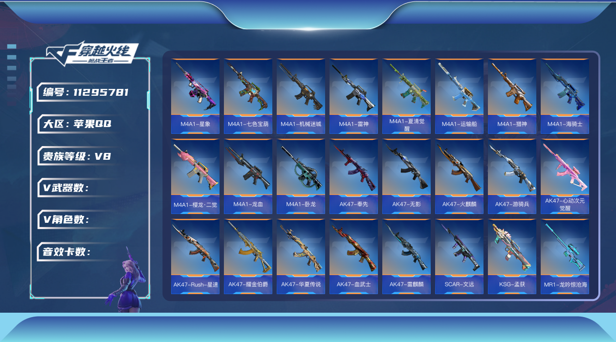 [11295781]可二次 V8 25王者武器 225英雄武器 555万化 传奇 武器:王者之影,王者之心,王者之武,王者之戮,王者之魄-冠军珍藏,王者之光,王者之狱,M4A1-星象,M200-幻神,AK47-奉先,AWM-妙才,SCAR-文远,KSG-孟获,M4A1-七色宝葫,MR1-龙吟惊沧海,81式-光明之神,KSG-天蓬元帅,王者之魂,王者之灵,王者之啸,王者之锋,AK47-黑武士觉醒,AK47-无影,AK47-火麒麟,AK47-游骑兵,M4A1-机械迷城,巴雷特-毁灭,巴雷特-极光,巴雷特-金色蔷薇,AK47-木兰,M4A1-雷神,QBZ03-死神,AUG-机械纪元,MK5-极光,贝雷塔-力拔山河,AK47-Rush-星速,AK47-耀金伯爵,M4A1-千变,M4A1-夏清觉醒,M4A1-运输船,M4A1-猎神,M4A1-海骑士,M4A1-樱龙·二觉,M4A1-龙血,M4A1-卧龙,AK47-心动次元觉醒,AK47-华夏传说,AK47-血武士,AK47-雷麒麟,GM6-战争风云觉醒,SCAR-幽暗骑士,AN94-四凶觉醒,SCAR-幽暗骑士觉醒,AN94-超新星,SCAR-探星者,9A91-天神,M14EBR-天神,暗杀神,AWM-裁决,AWM-天龙